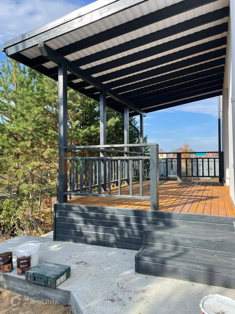Ступени и пол облицованы керамогранитом, ограждения из сосны, обработанные специальной пропиткой цвет антрацит.