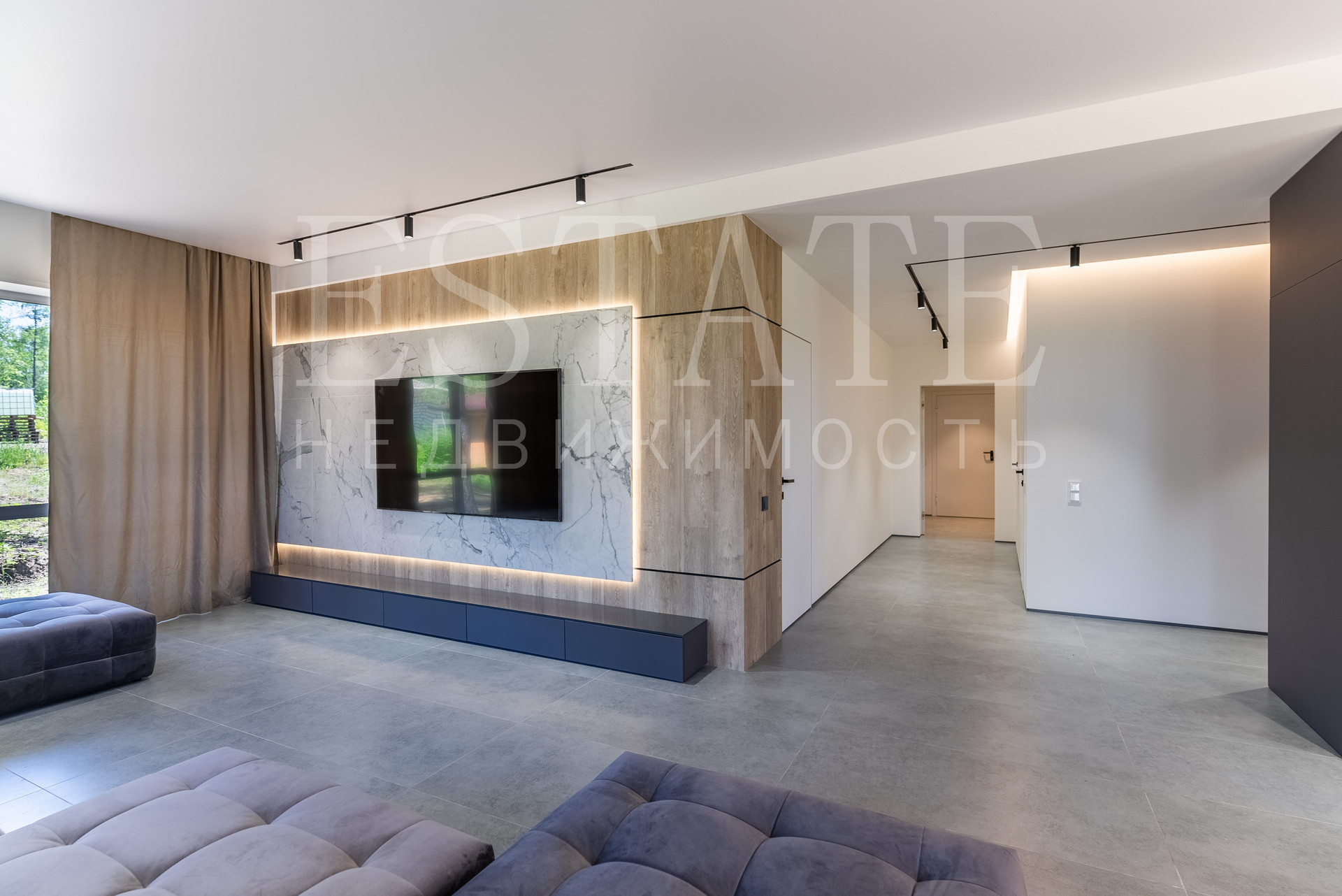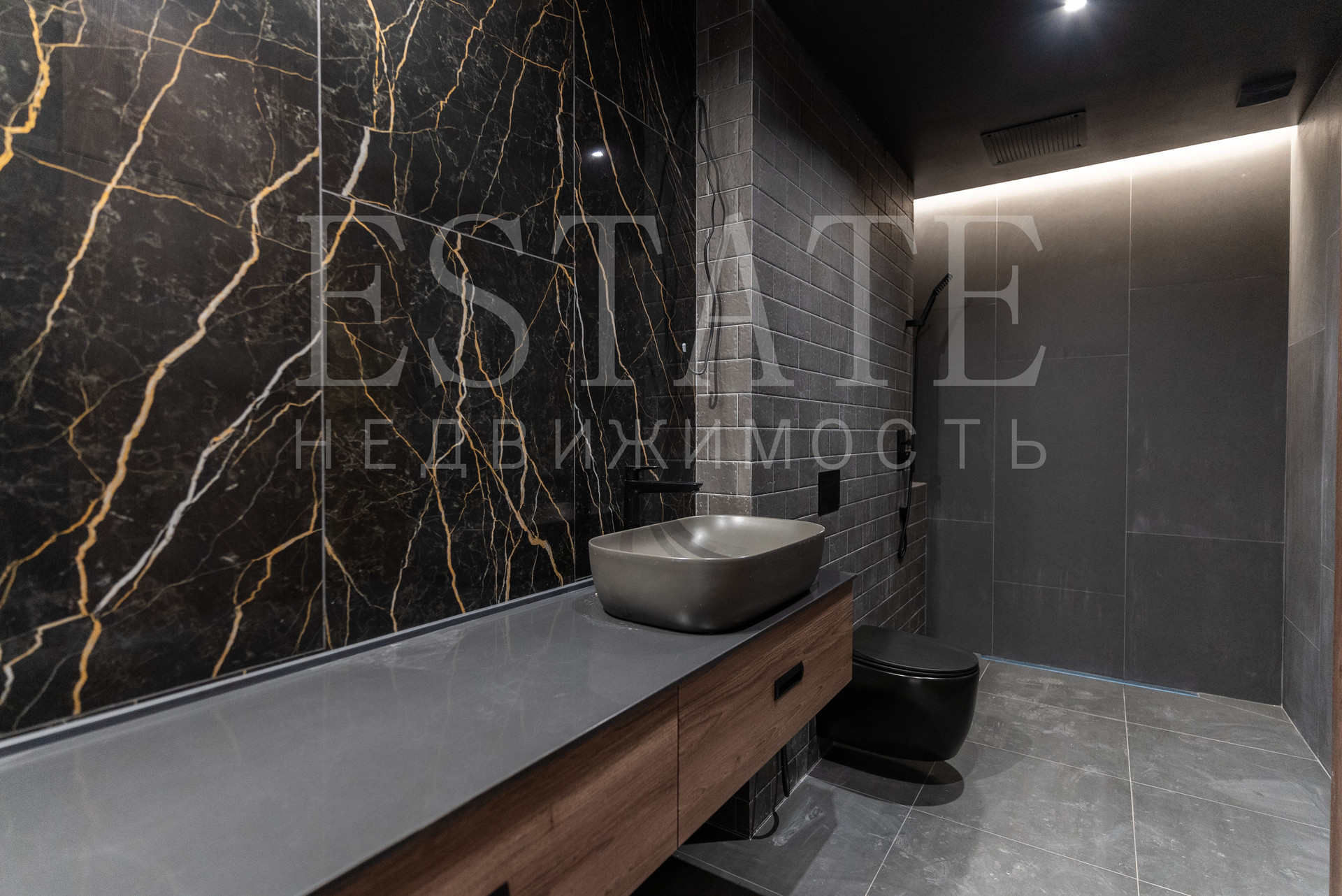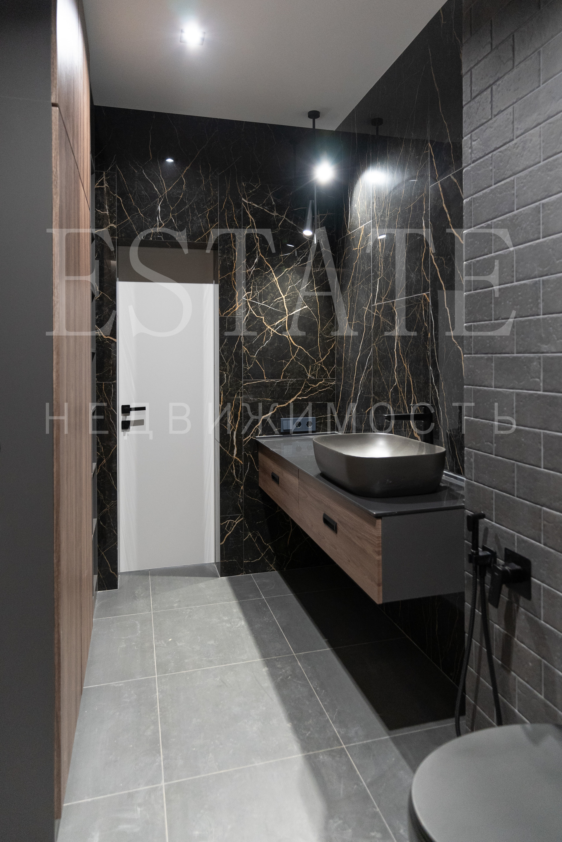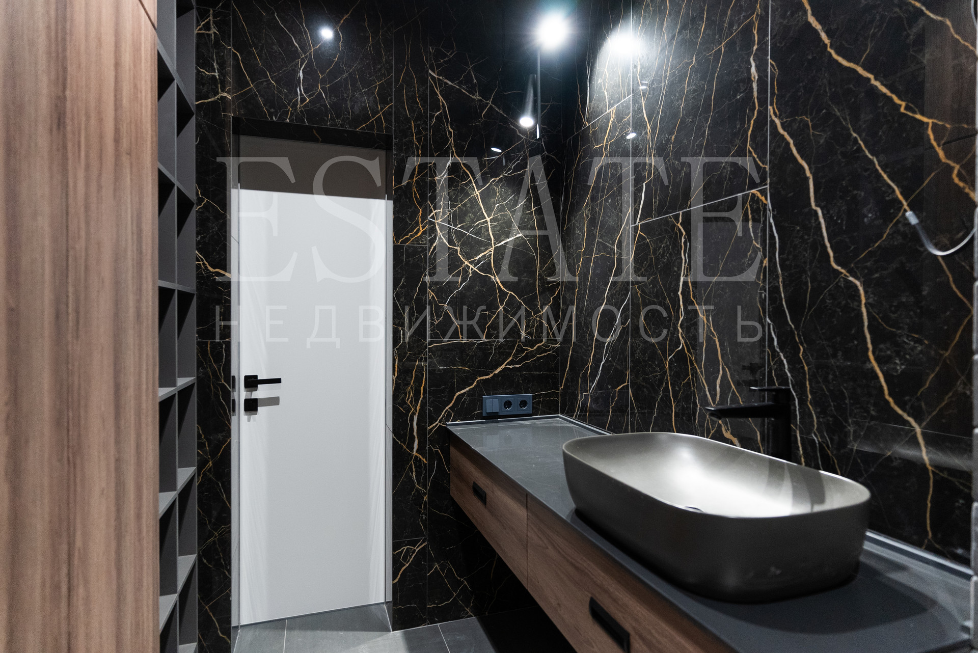 • в отделке элементов стен и потолков использован полированный керамогранит 1200х600, кварцвинил под дерево.