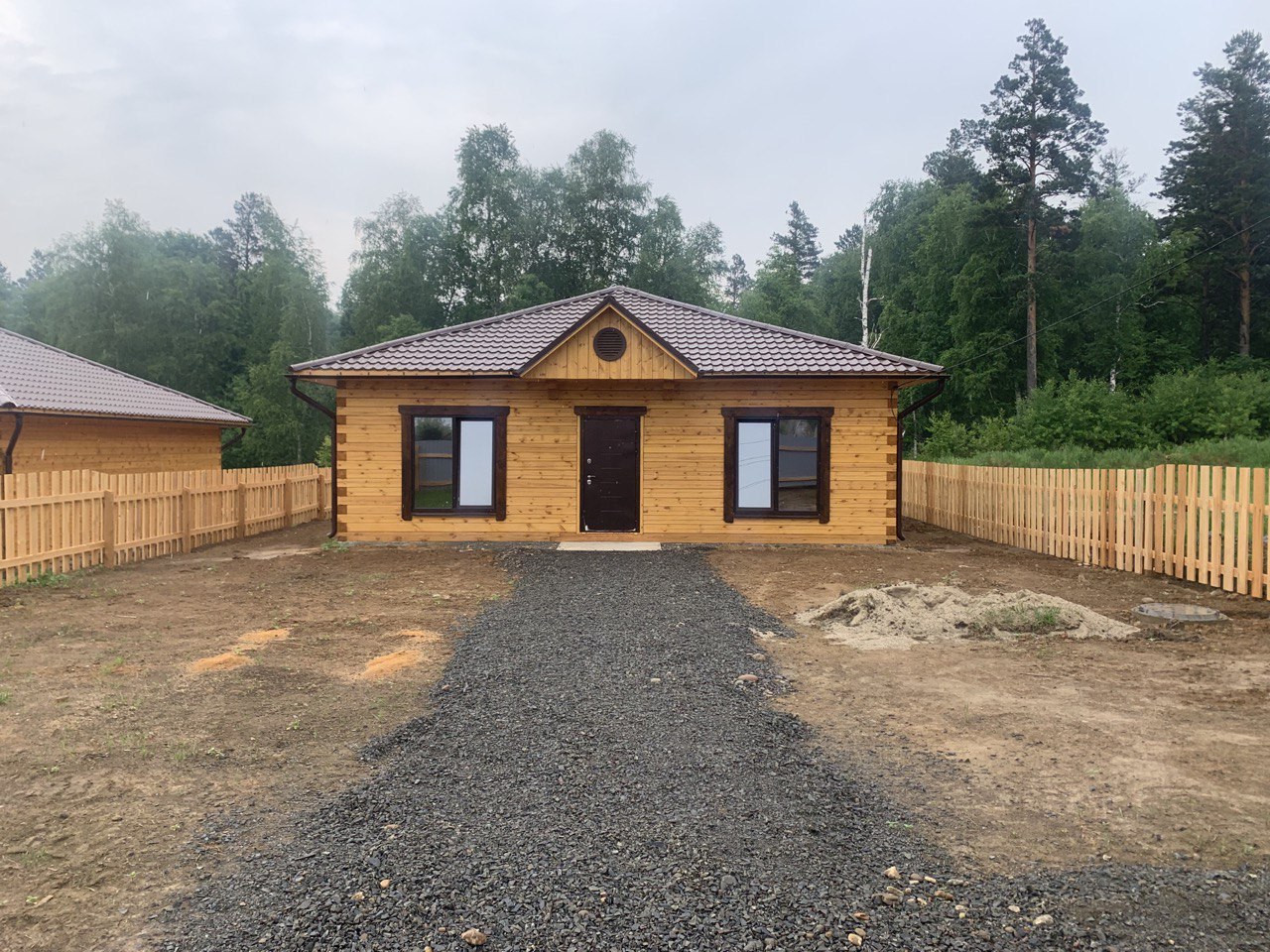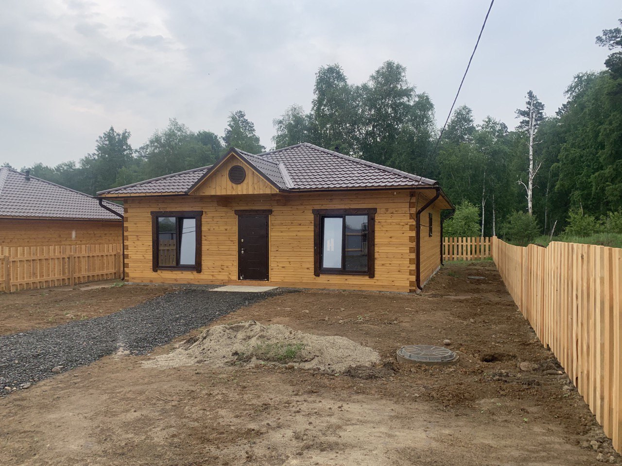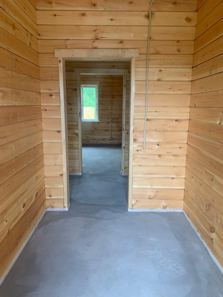 В доме проведены работы по разводке электричества по ГОСТу с установкой выключателей и розеток, проведены коммуникации холодного водоснабжения от скважины и горячего водоснабжения от бойлера. Произведен монтаж многоконтурного теплого пола, на полу ровная полусухая стяжка, установлены теплые 5-ти камерные окна с внешней ламинацией цвета шоколад, что гармонично сочетается с металлочерепицей кровли. Потолки обшиты сухой евровагонкой, что позволит дому дышать. Крыша вальмовая четырехскатная с утеплением и вентиляцией. Качественные двери с терморазрывом. Электричество по договору 15кВт, скважина, септик 6м3. Участок выровнен, огорожен с 3х сторон доской, фасадная часть забора из профлиста цвета шоколад, распашные ворота и калитка на сварной раме. Дорожка перед домом отсыпана щебенкой.