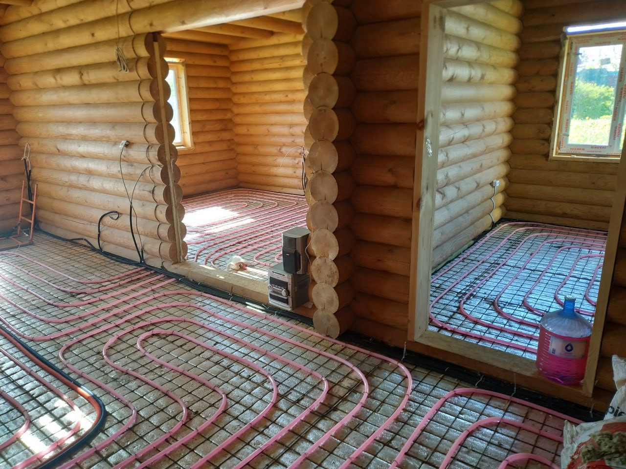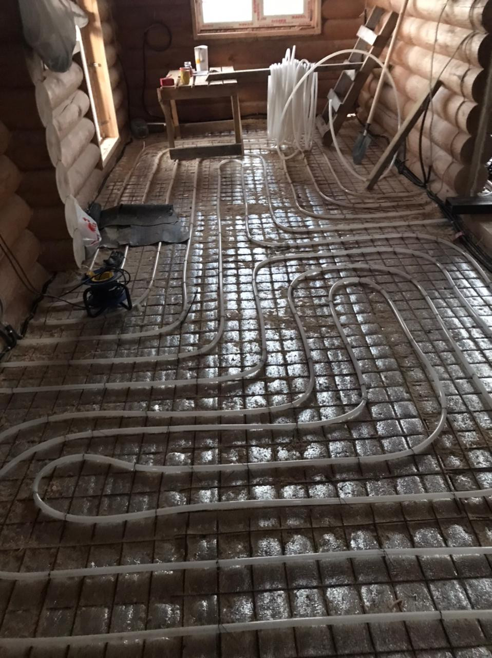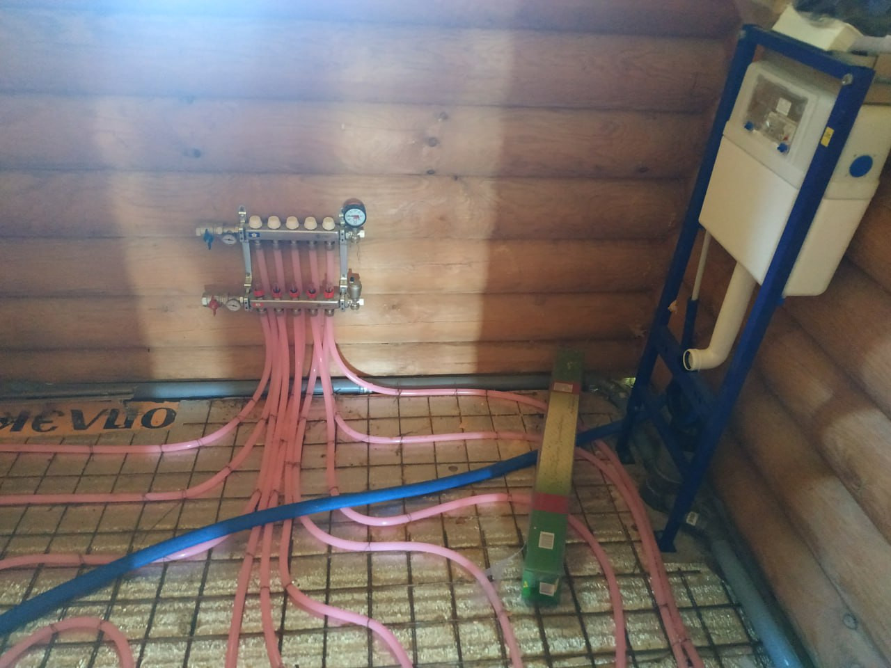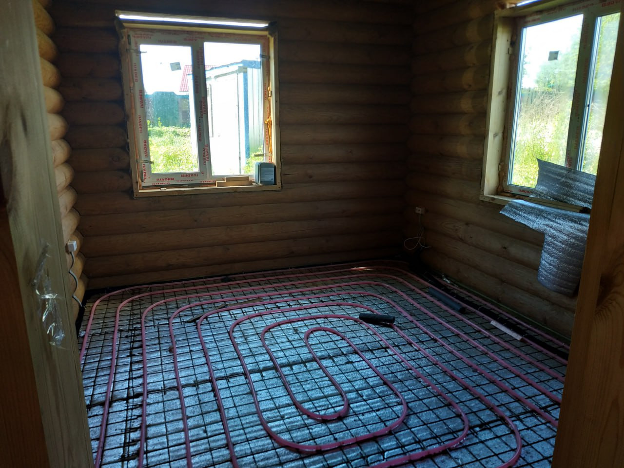 По первому этажу смонтированы тёплые полы установлена инсталляция, прокинута проводка, установлен трап для душа - пол готов к стяжке!
