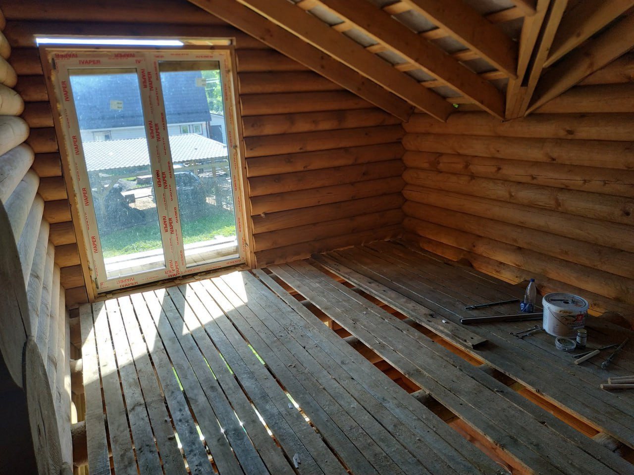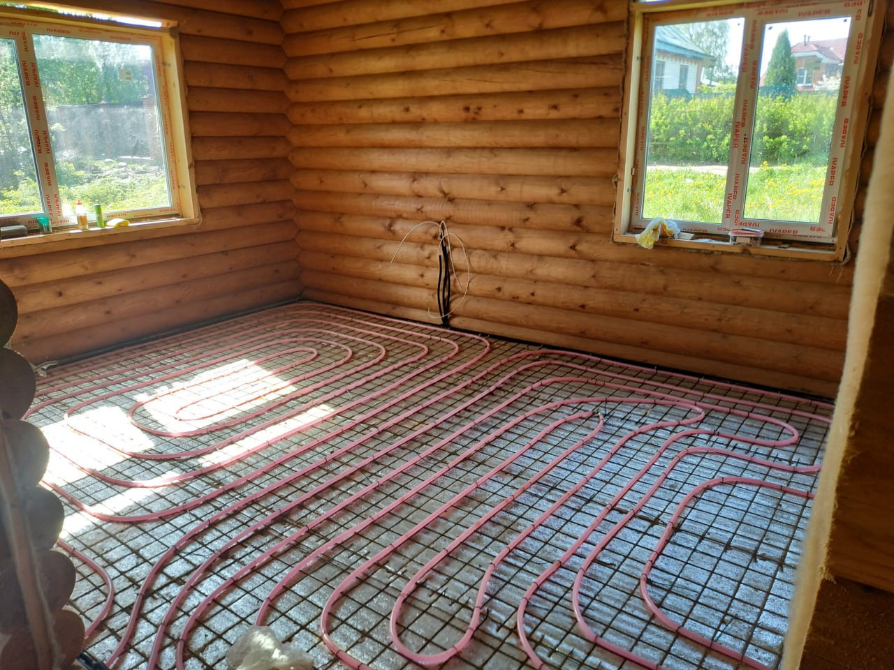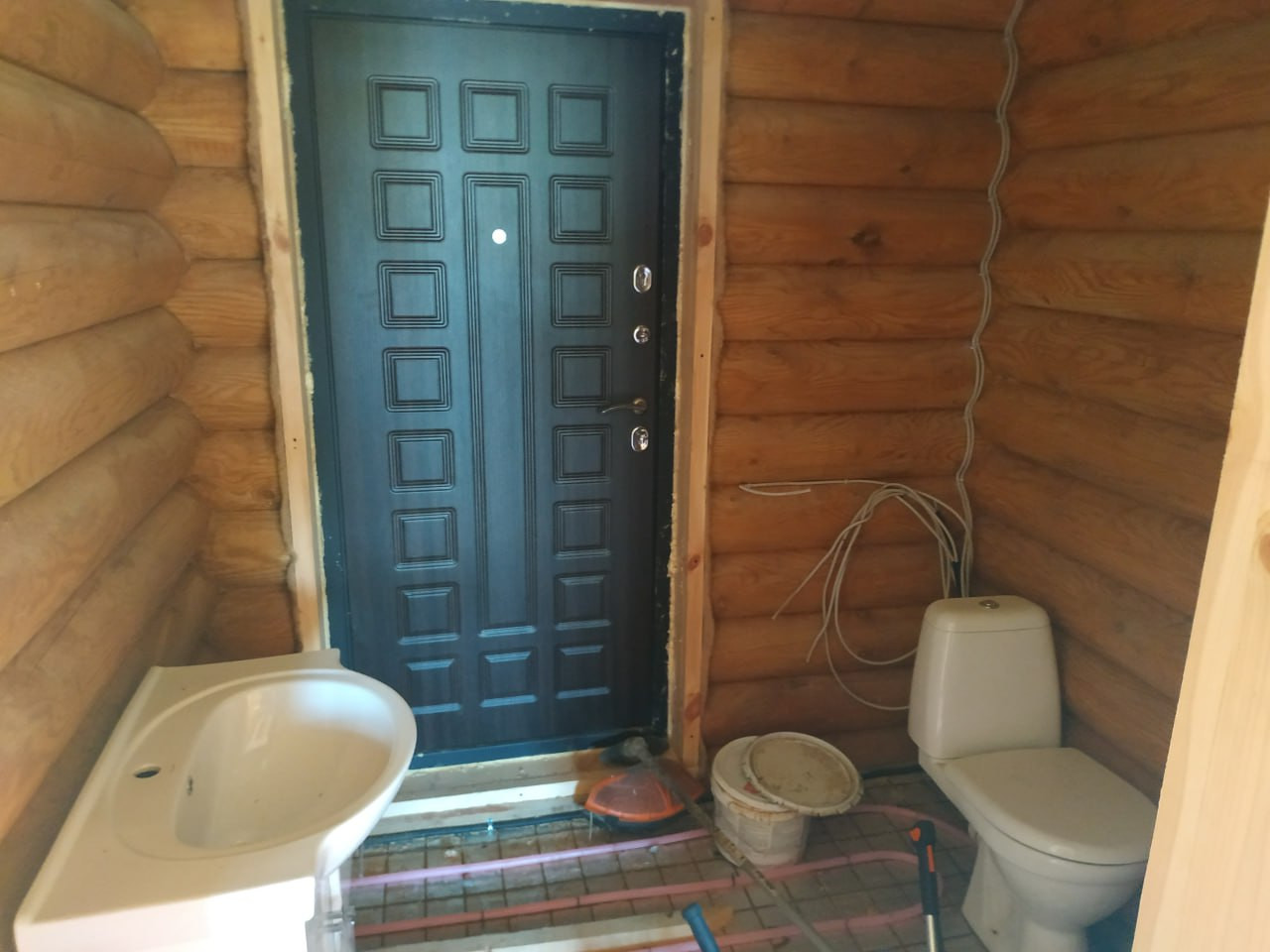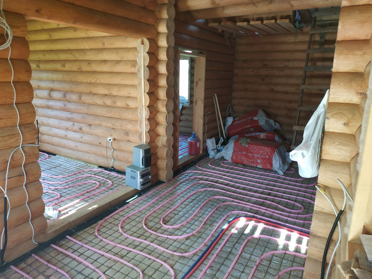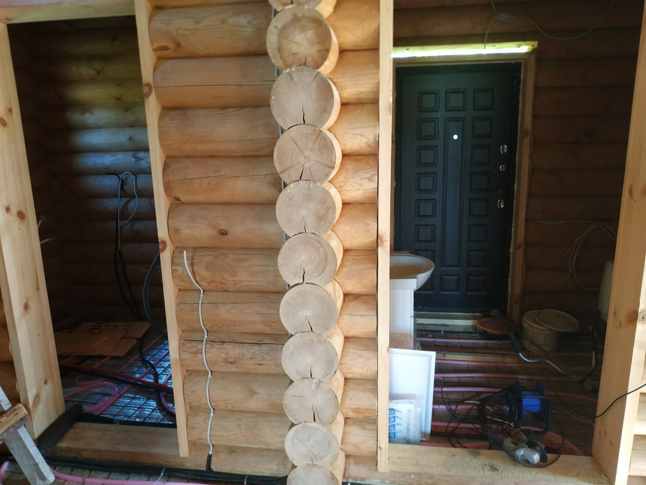 По первому этажу смонтированы тёплые полы установлена инсталляция, прокинута проводка, установлен трап для душа - пол готов к стяжке!