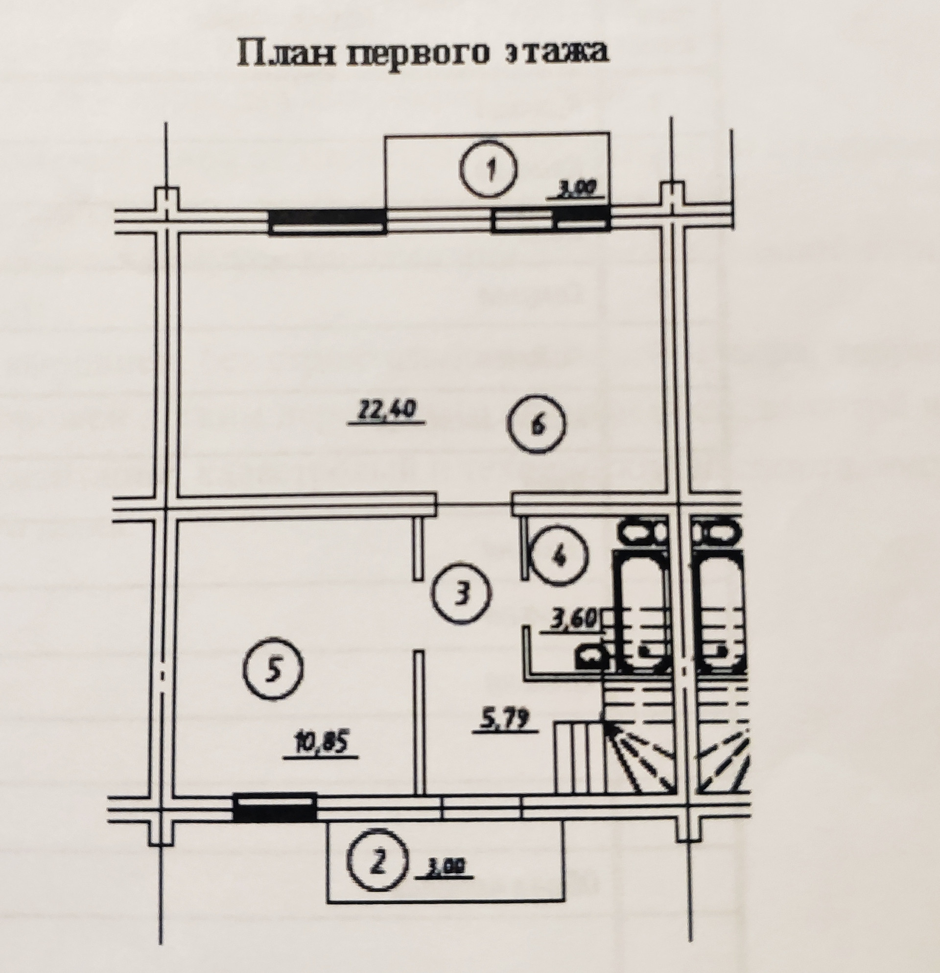 1-й этаж: гостиная-кухня с выходом на собственный двор 22,4 кв.м., комната – кабинет (гостевая) – 10,85 кв.м., коридор – 5,8 кв.м., ванная  - 3,6 кв.м., крыльцо – 3 кв.м.