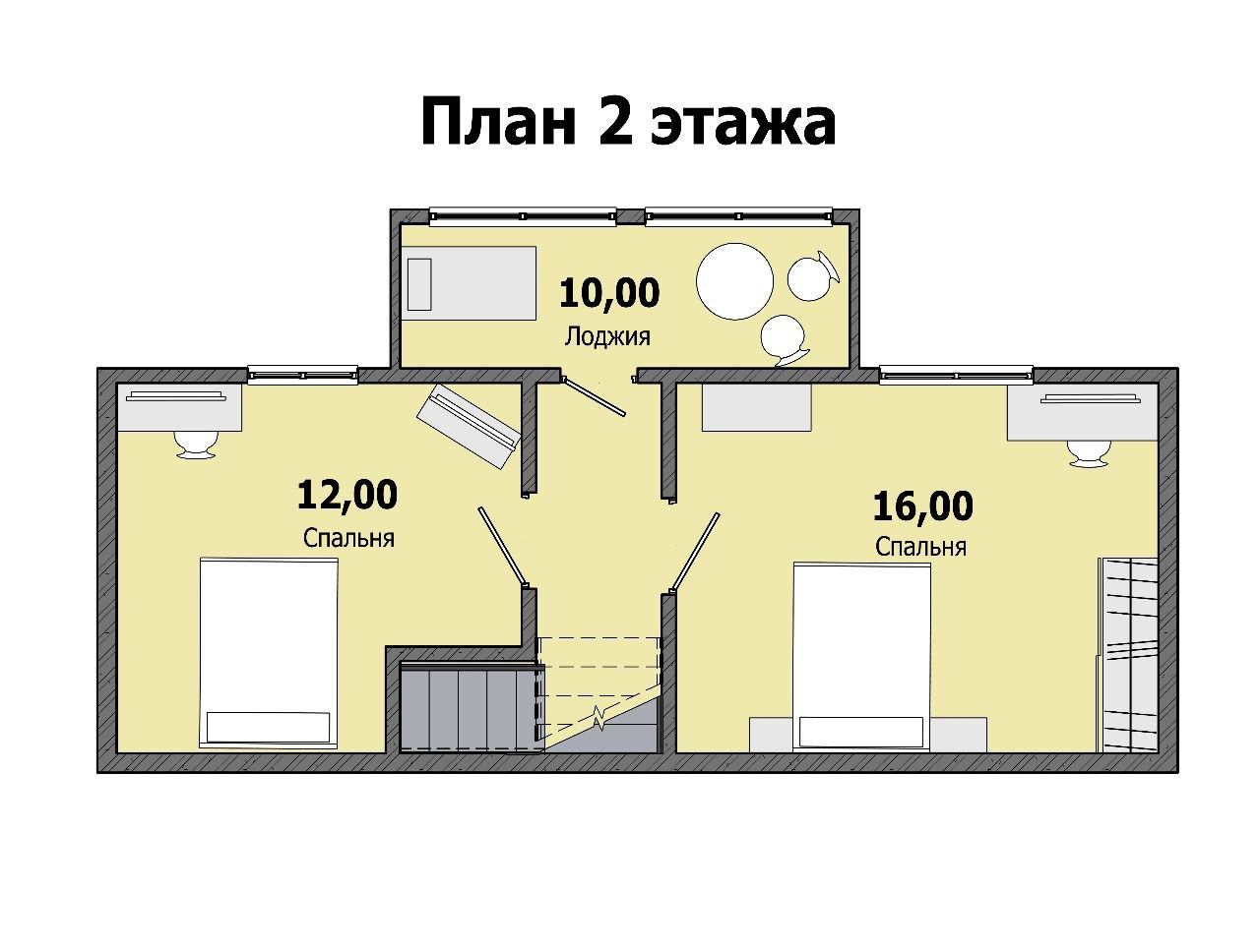 2-й этаж: две спальни – 16 + 12 кв.м., застеклённая лоджия – 10 кв.м.