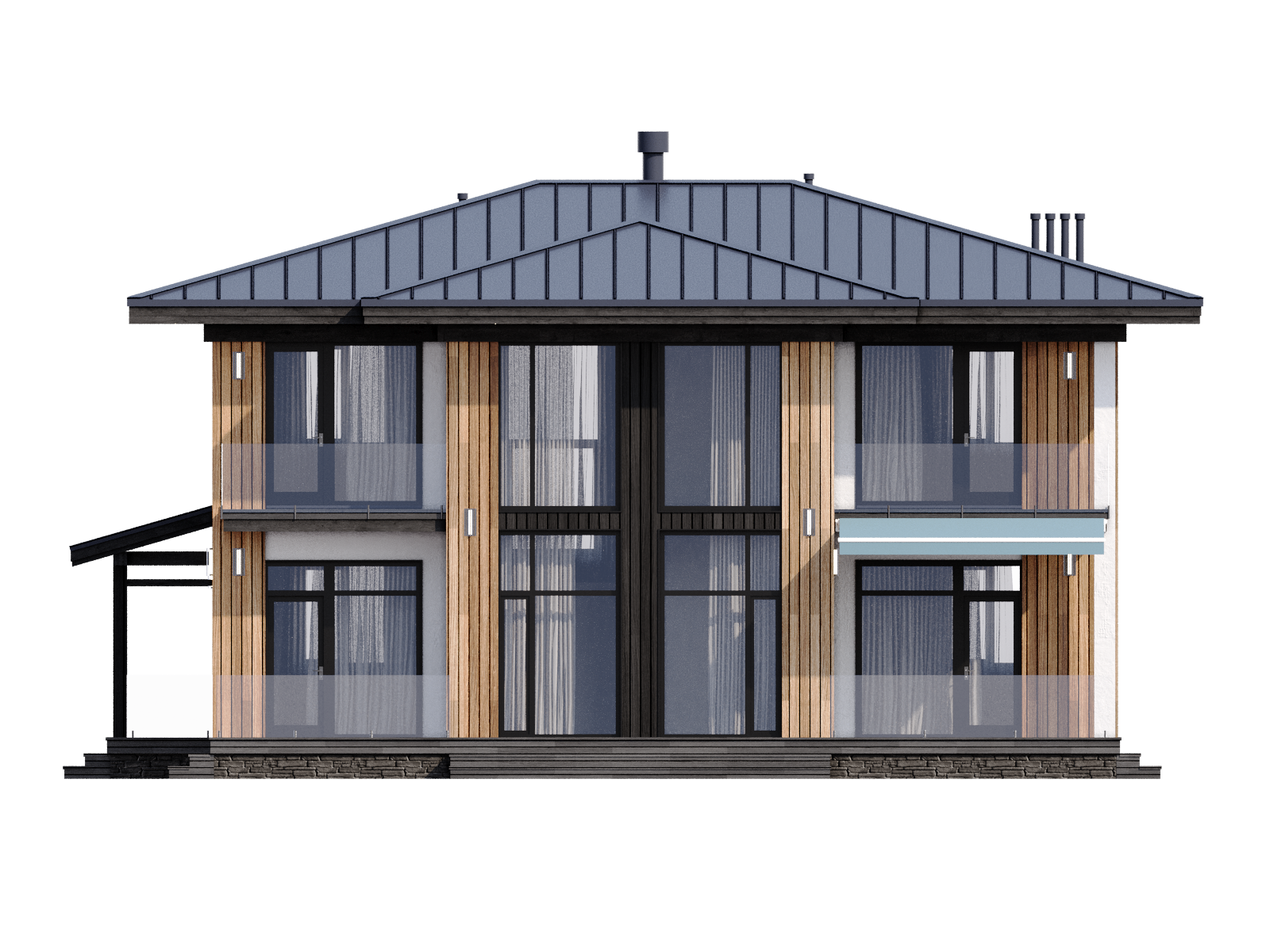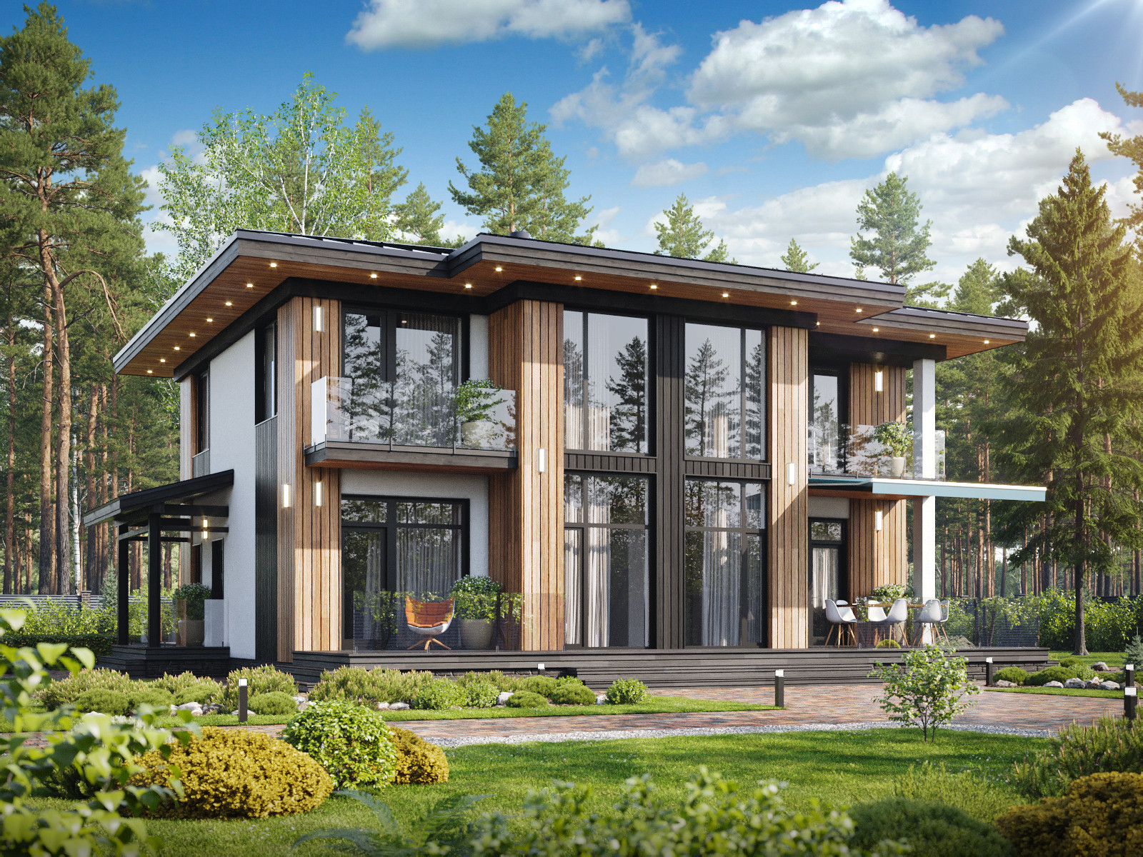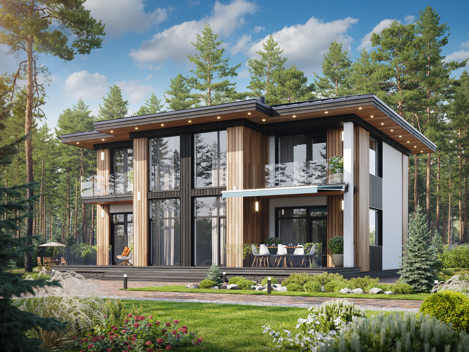 - Комбинированная внешняя отделка: декоративная штукатурка и натуральное дерево (планкен)