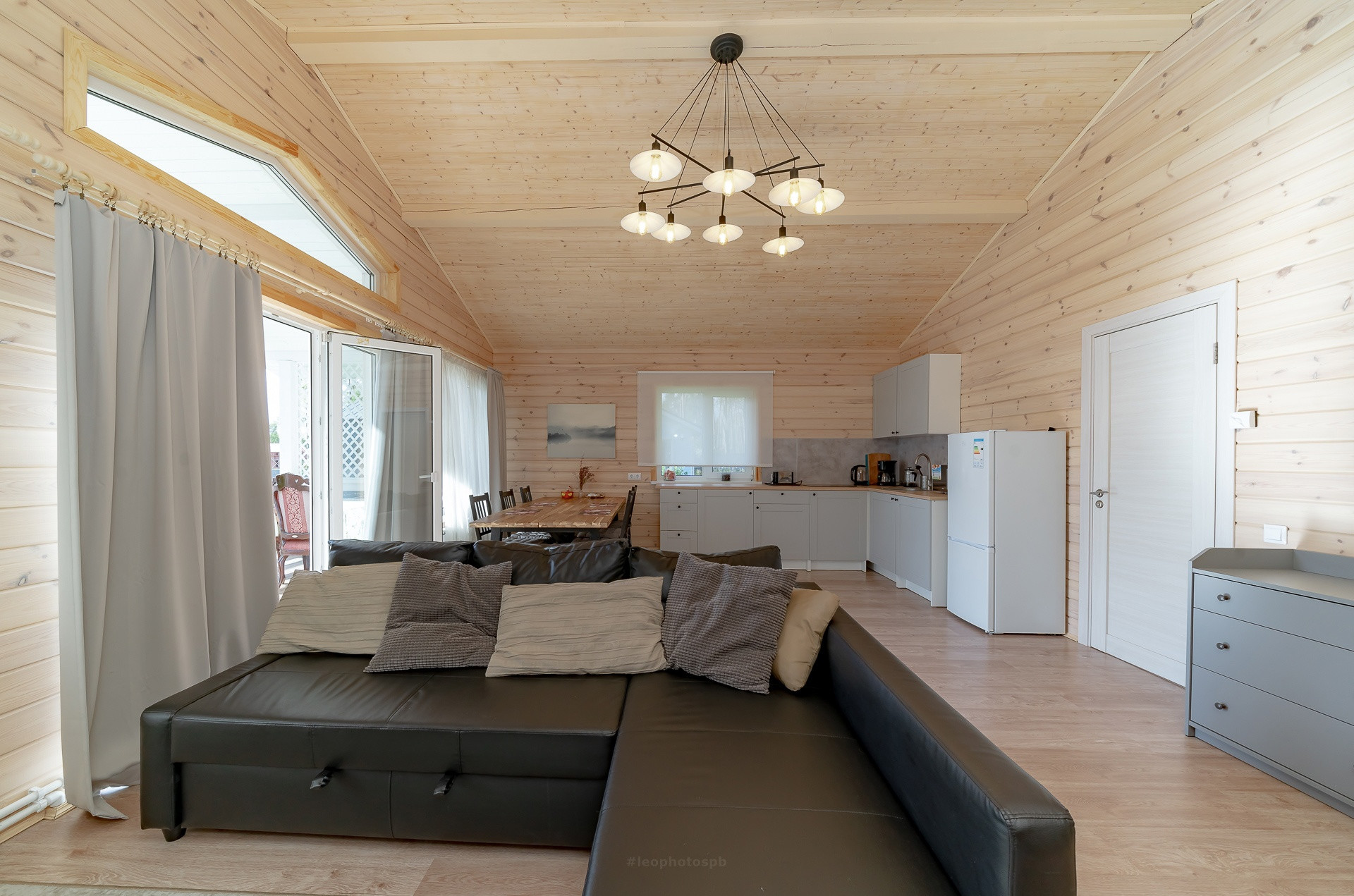 В доме просторная кухня-гостиная 31,7 кв.м., 2 спальни по 11,2 кв.м., крытая веранда 25 кв.м., сауна и ванная комната. В стоимость дома входит вся мебель, техника и аксессуары (включая полотенца, постельное бельё, посуду).
