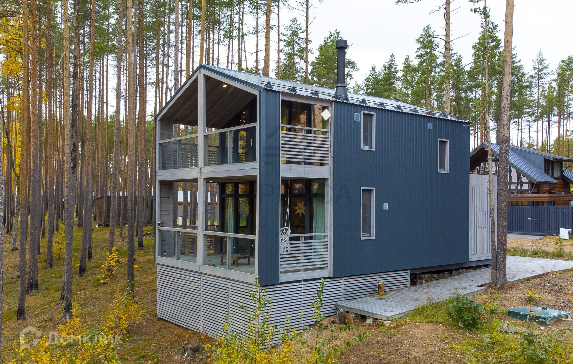 Дом располагается в окружении высоких сосен.
