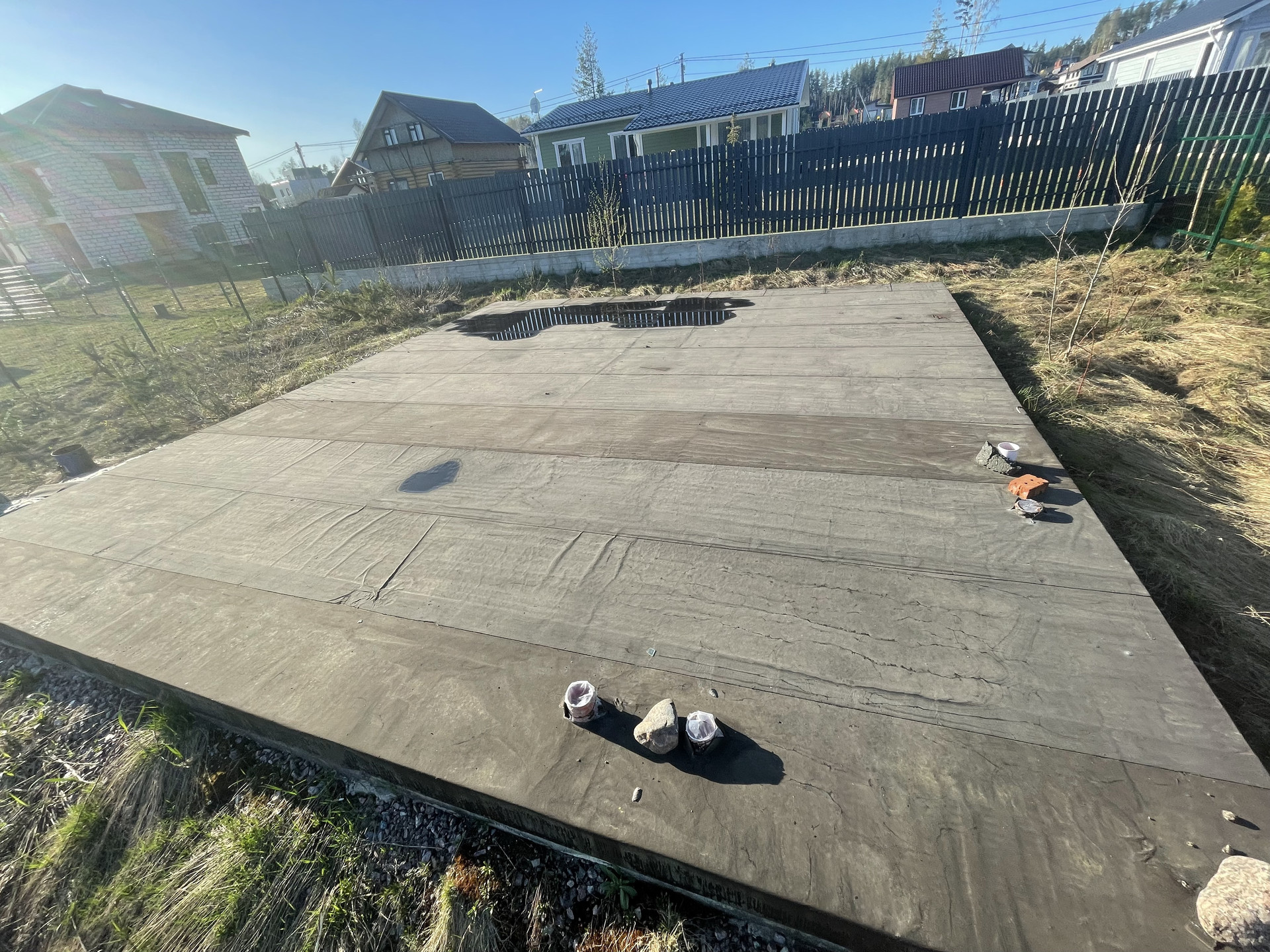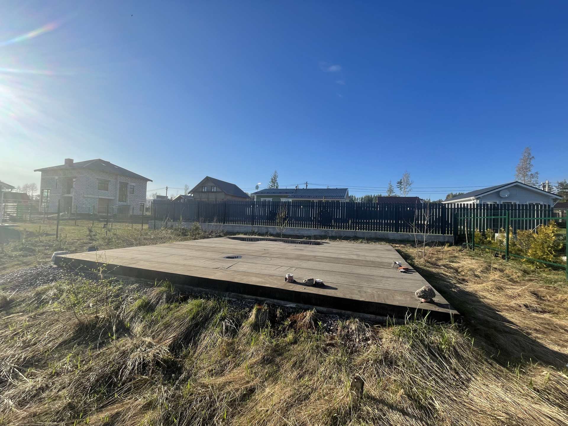 На территории имеется залитая плита под фундамент 8х8,5, сделан заезд, подключено электричество, а также есть канализация.