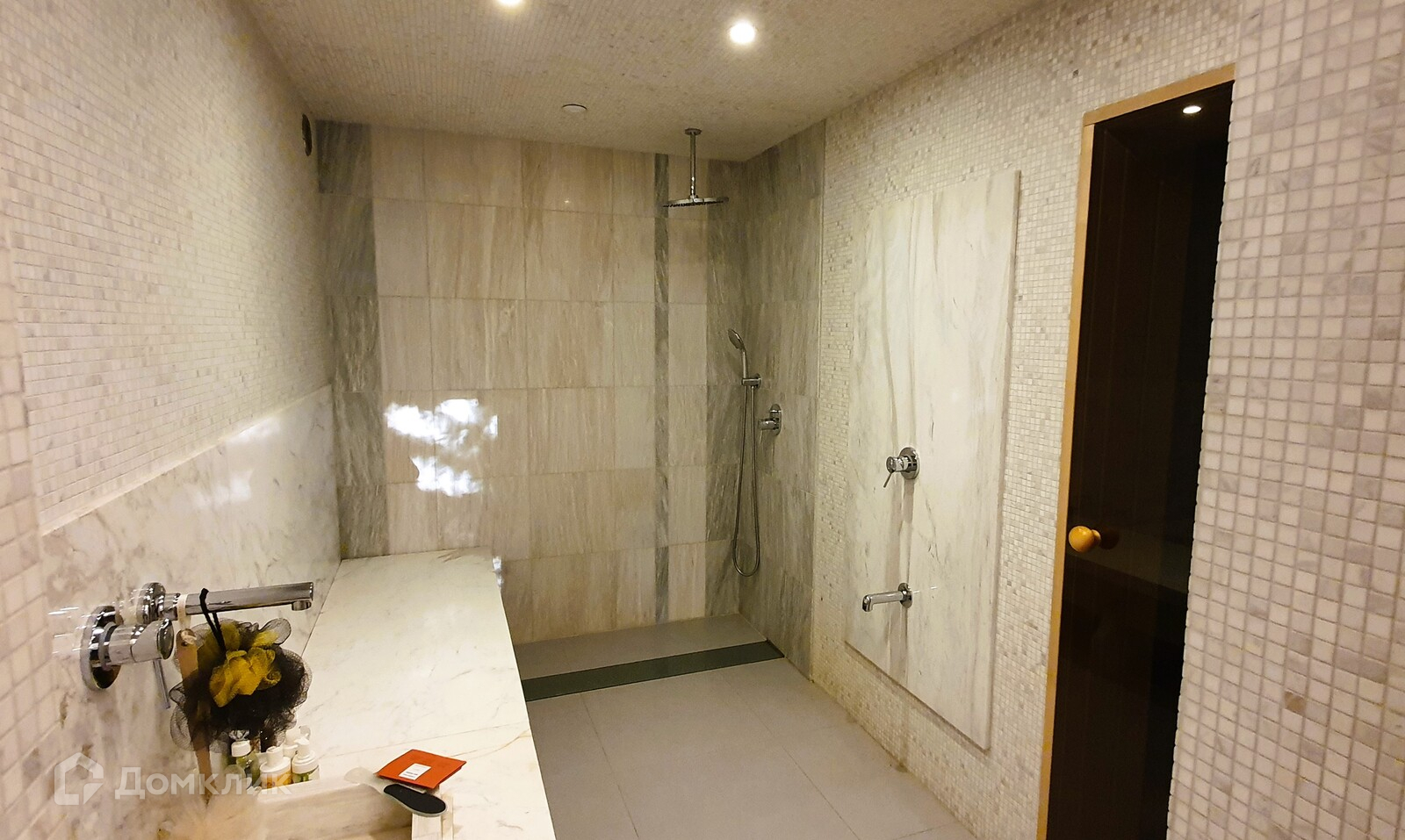 Первый этаж - СПА с дровяной сауной, душевой зоной, выполненной из натурального мрамора (под "хамам") и просторной зоной отдыха 30м2 (в этой зоне имеется чаша под небольшой бассейн (8м2) с заложенными коммуникациями, в настоящий момент не используется - перекрыт полом).