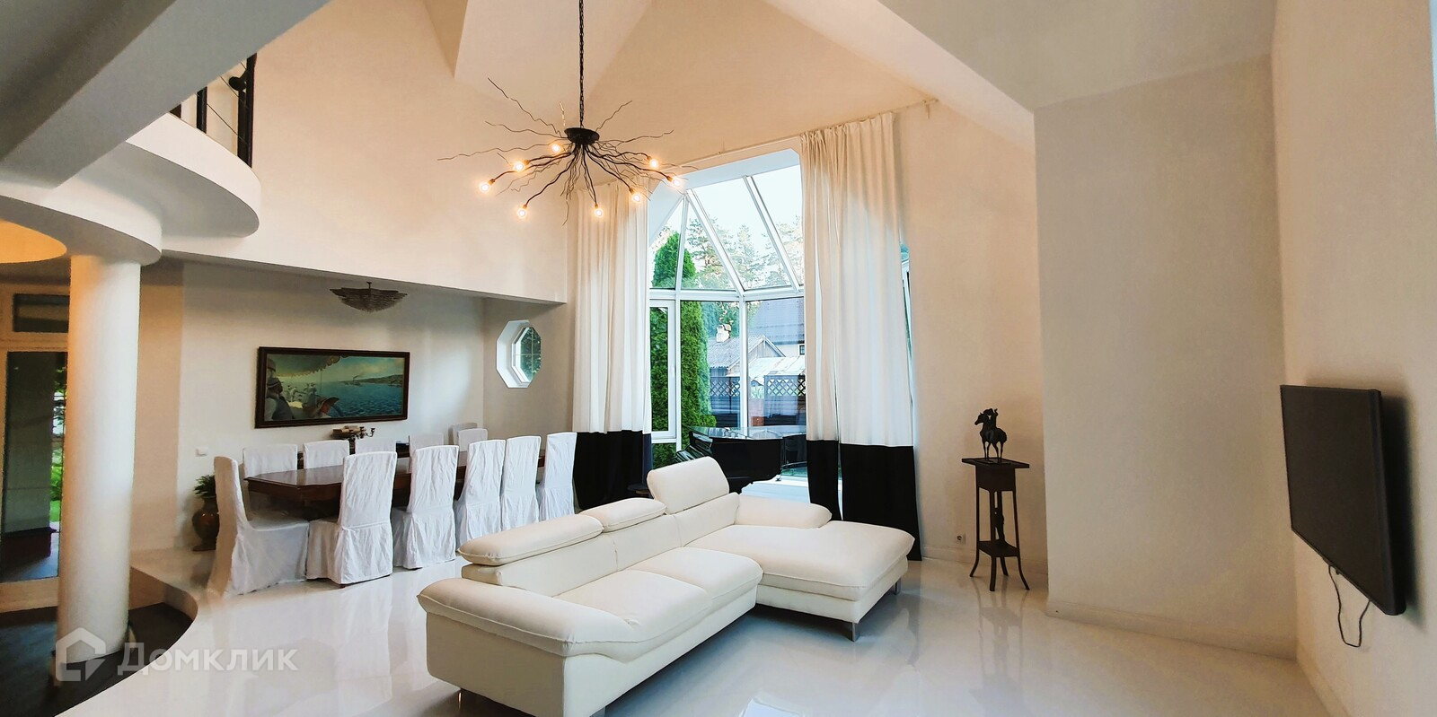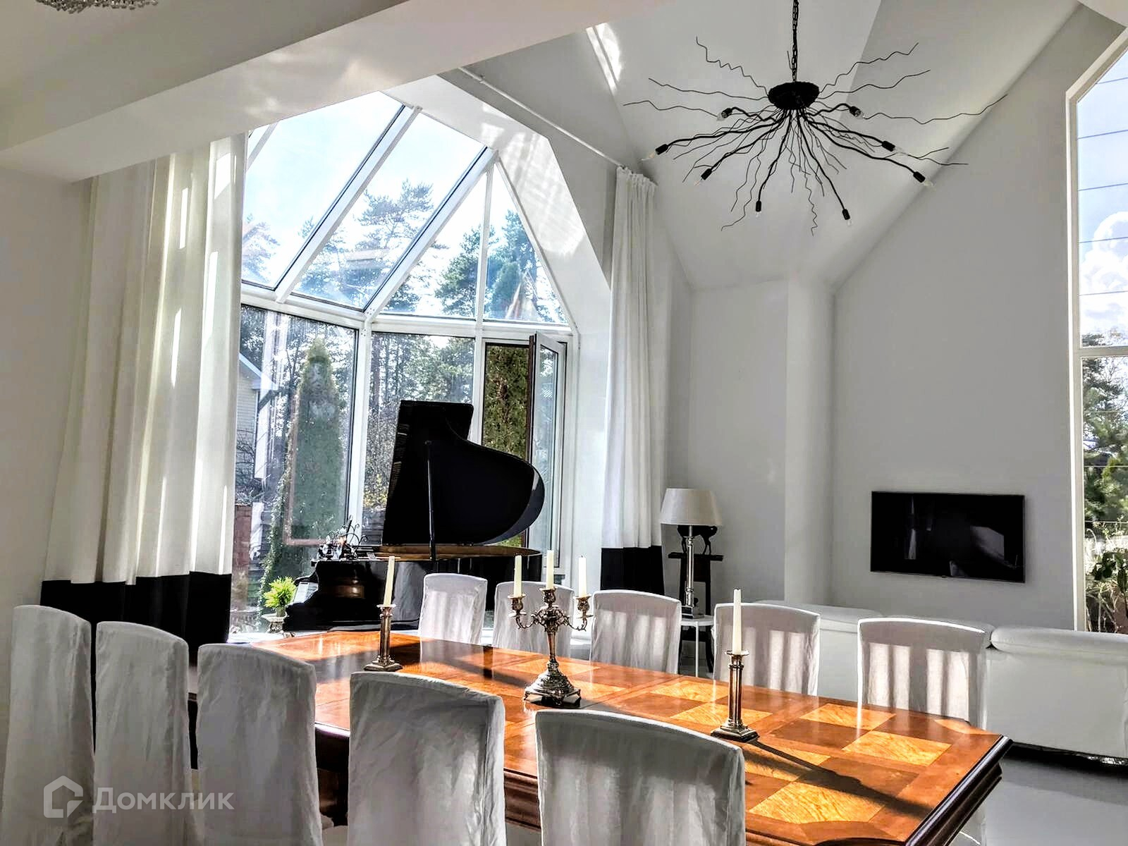 Большая площадь остекления - деревянные стеклопакеты, объемный панорамный эркер из алюминиевого профиля в главной гостиной первого этажа.