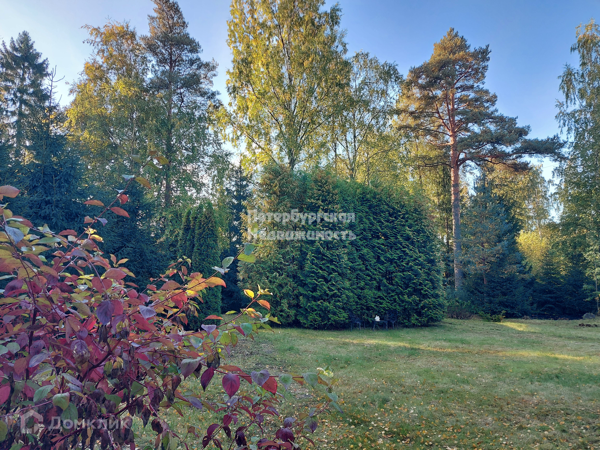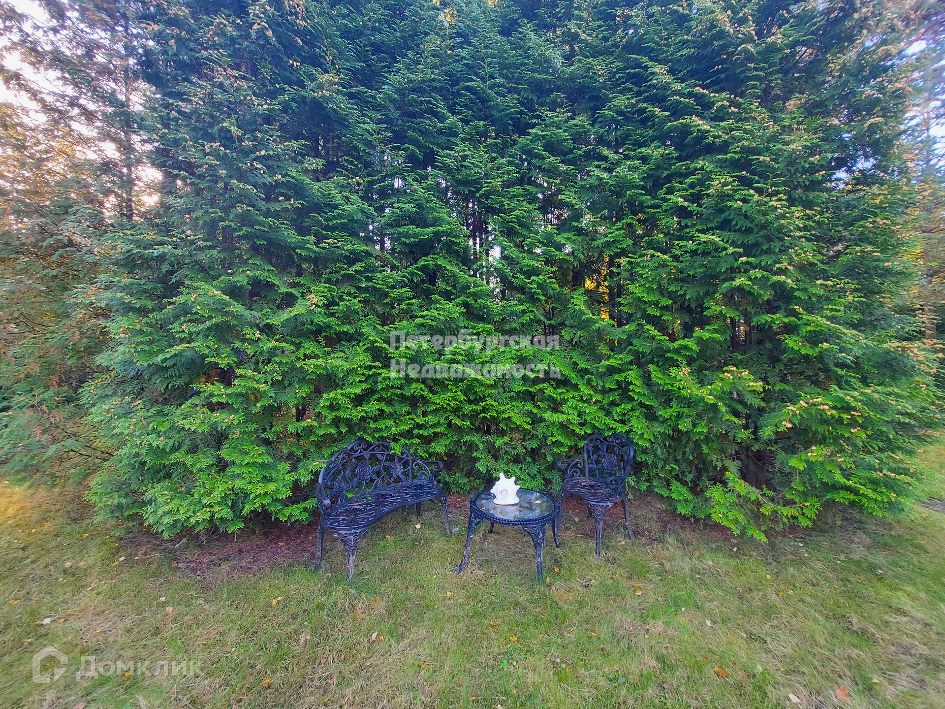 На большей половине участка расположены вековые сосны, туи, ягодный тис, что образует уникальный микроклимат.