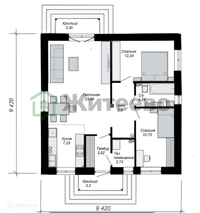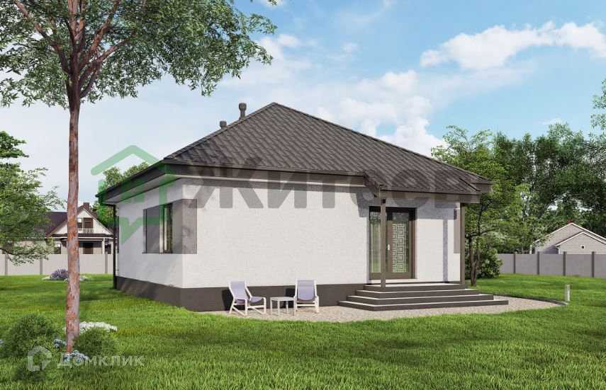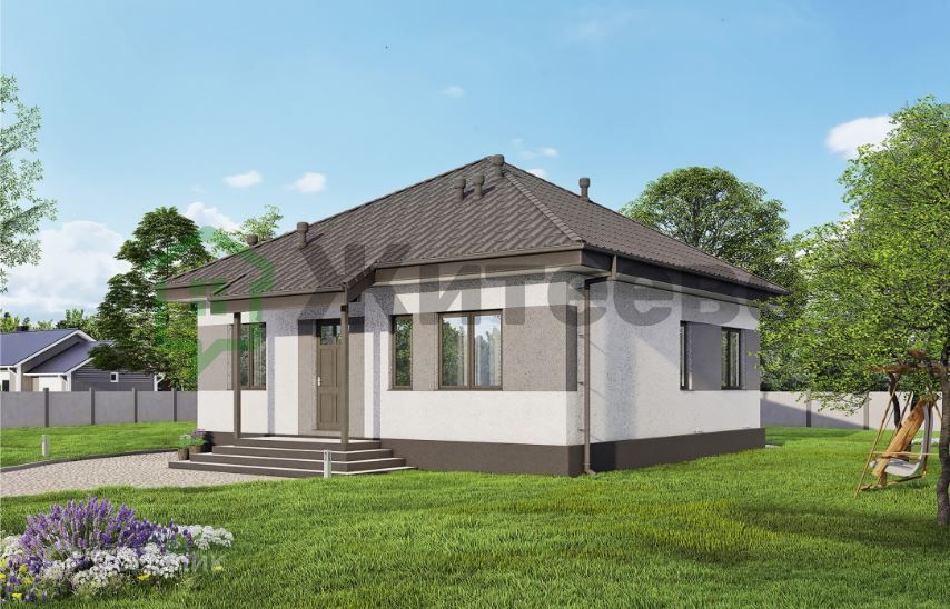 Дом имеет общую площадь 82 м2 и две просторные спальни площадью 12,2 м2 и 10.7м2. Фундамент свайно-ростверковый. Стены из газоблоков 300мм с утеплением 100 мм, обеспечивают отсутствие мостиков холода. Шумо- и теплоизоляция дома на высоком уровне, что делает его очень тёплым. Кровля выполнена из металлочерепицы.