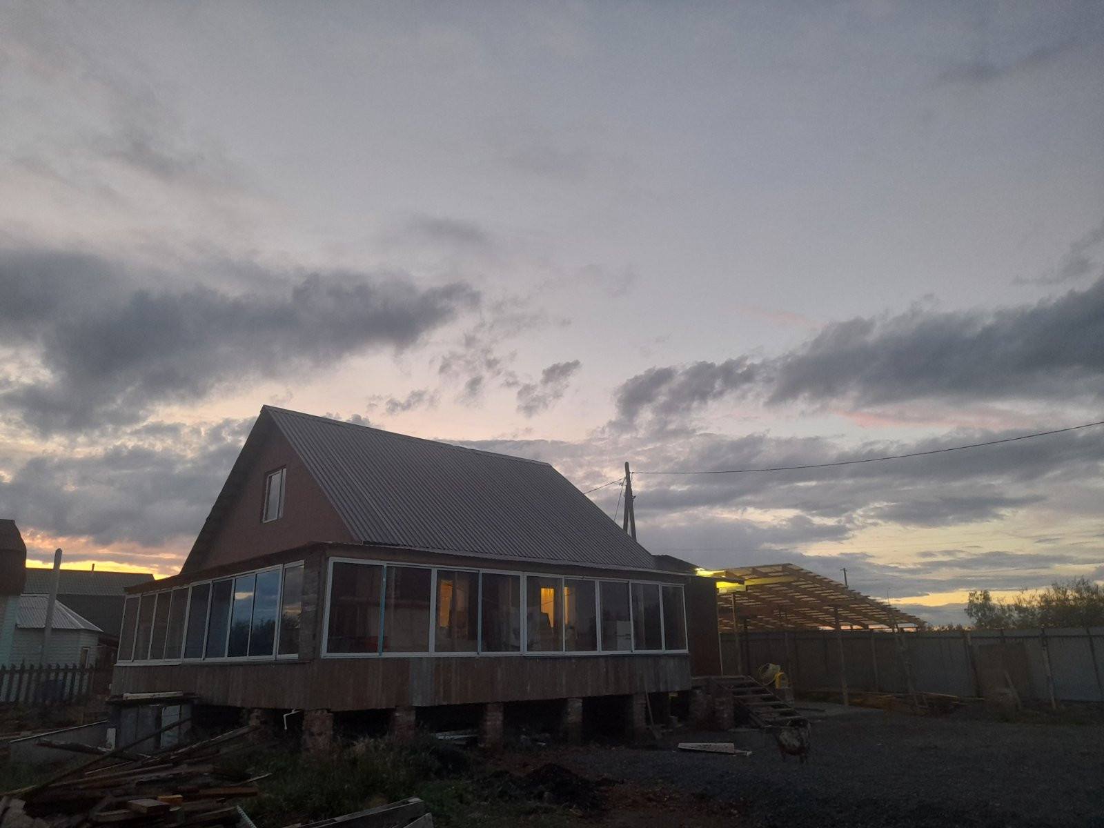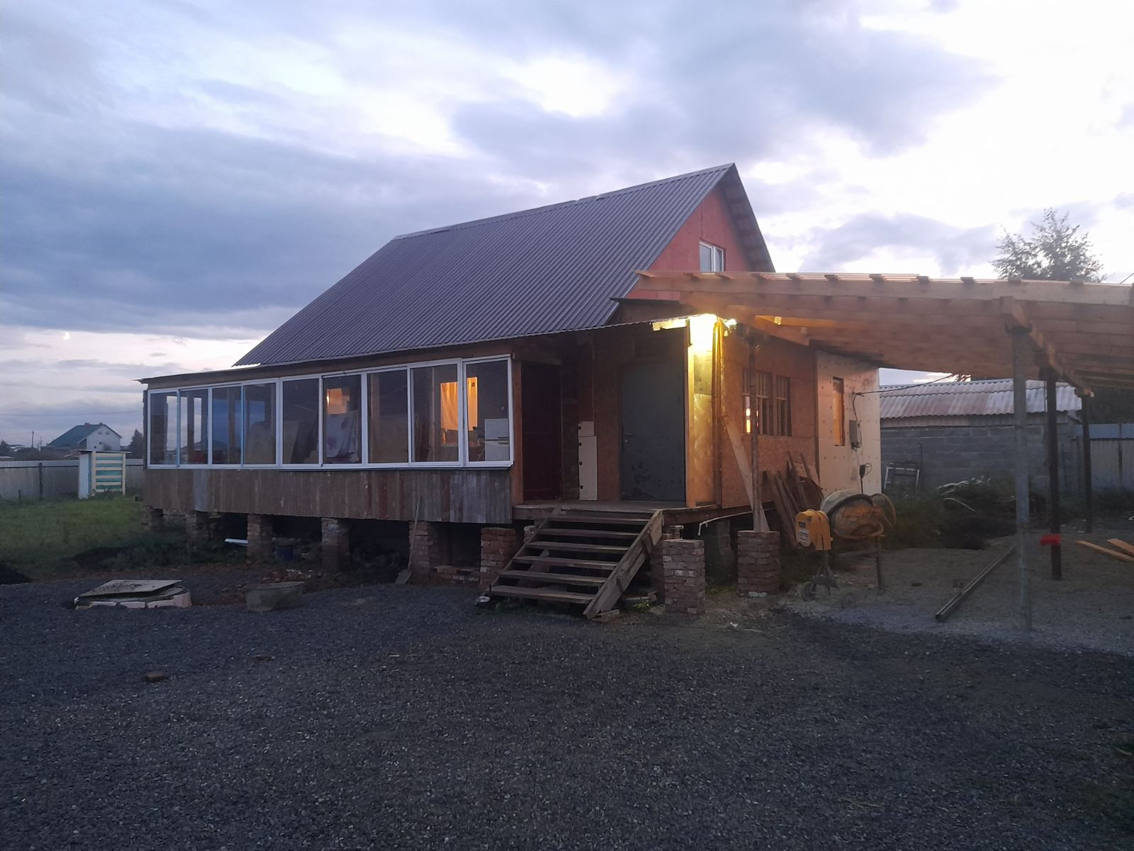 По периметру дома сделан большой холодный балкон. Летом спасает от жары, зимой от сильных ветров.