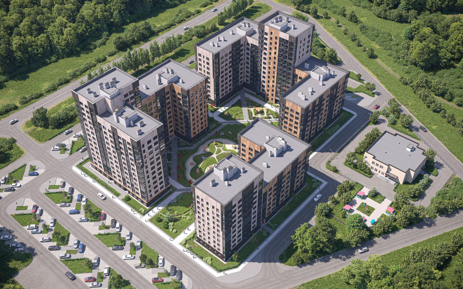 Архитектурный облик дома выполнен в духе современного минимализма в теплых природных гармоничных тонах. Каскадные дома переменной этажности. Уникальный облик каждого дома. Дома создают уютный закрытый двор, обеспечивая тишину и комфортную атмосферу.