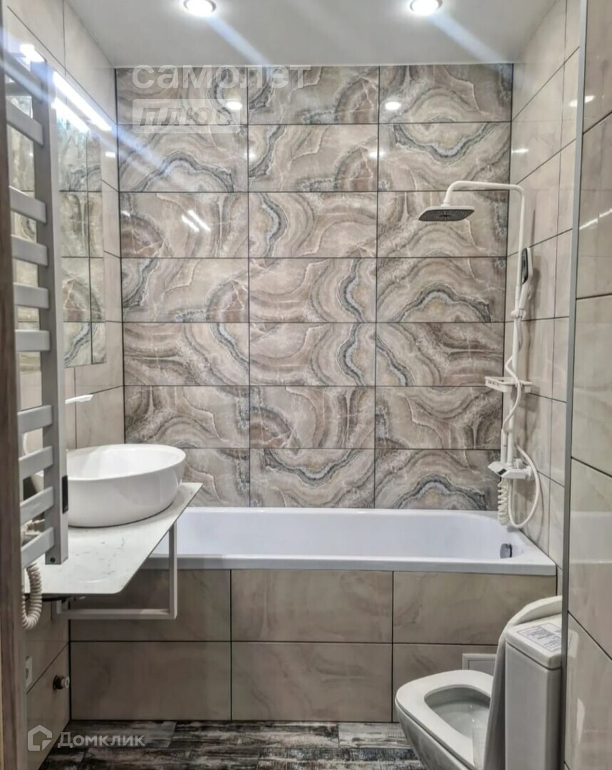 В ванной комнате установлены зеркало с подсветкой, столешница из керамогранита с накладной раковиной, унитаз испанской фирмы "Alcora Bridas" и акриловая ванна длинной 1.7 метра.