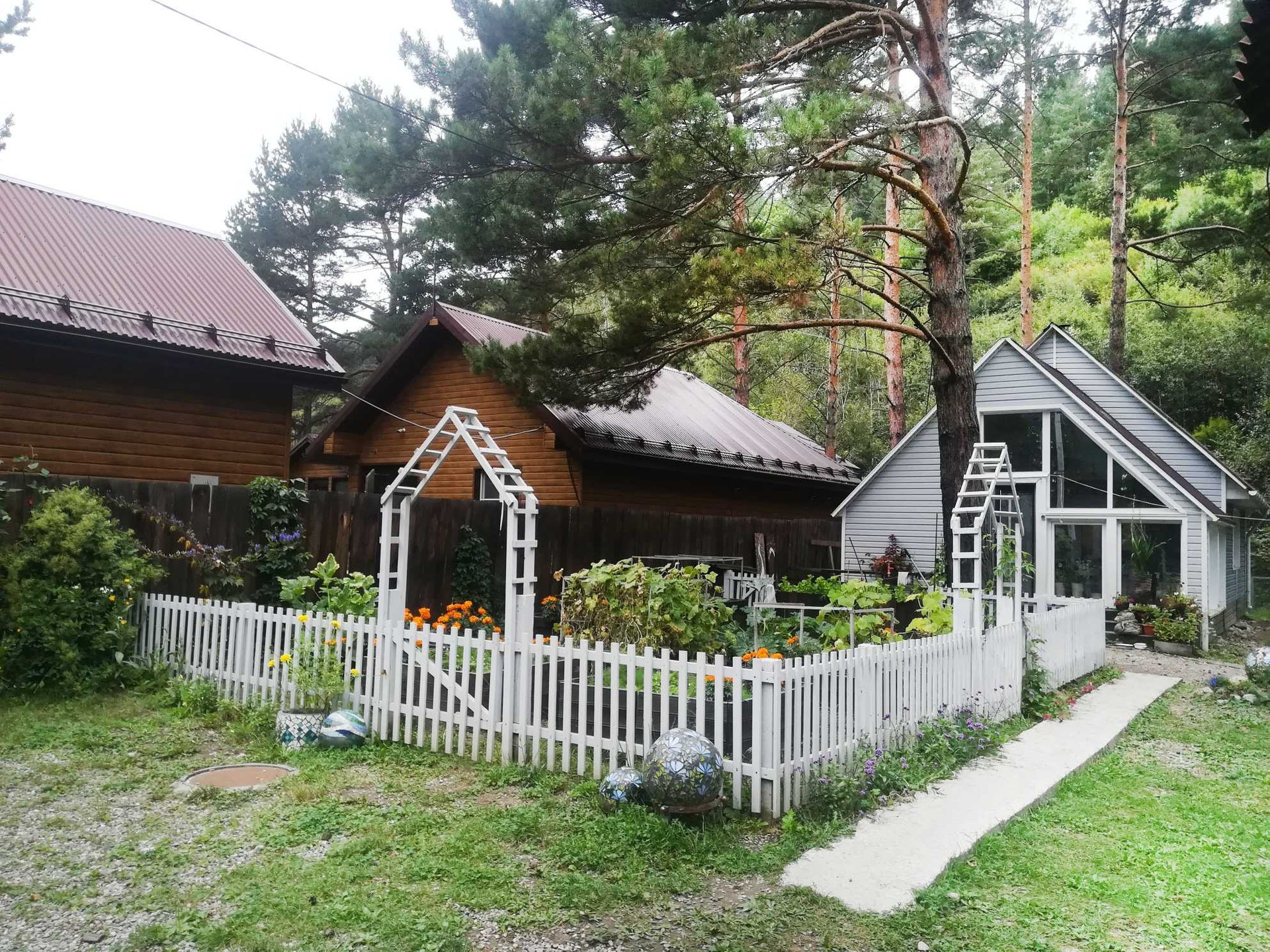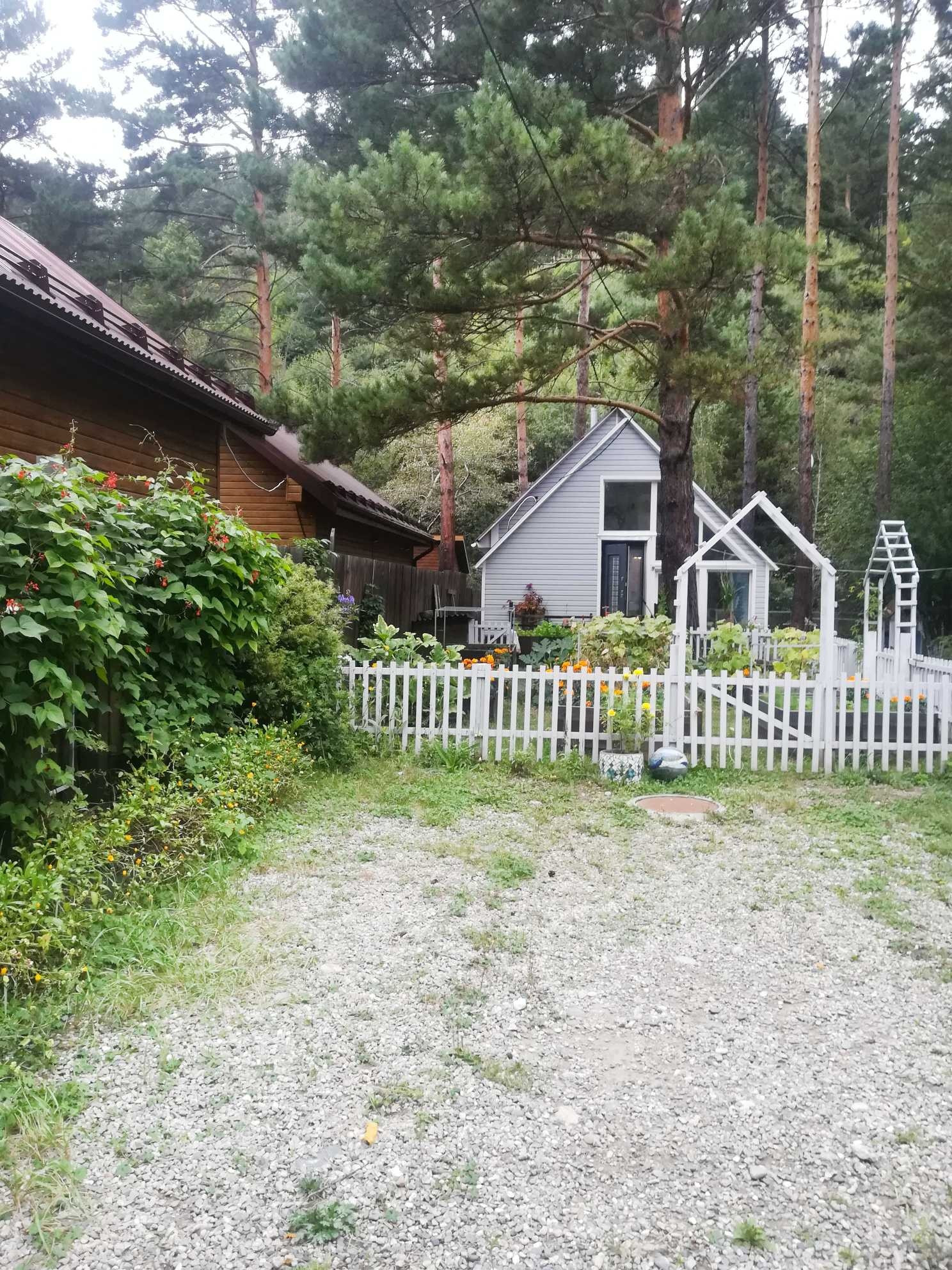 Участок с северной стороны закрыт горой, что создает микроклимат, позволяющий клубнике плодоносить аж до октября, на гору можно подняться и можно увидеть живописные виды на реку. На территории участка расположен лес, состоящий из высоких корабельных сосен, так же растет рябина, калина, боярышник, кусты акации. Из культурных растений посажена малина, смородина, крыжовник, жимолость. Зона огорода (выполненного в дизайнерском стиле) ограждена невысоким забором из штакетника, грядки высокие. Так же на участке построен гостевой дом, утепленный, строился для сдачи в аренду, и служит для этих целей. Есть гараж 6 на 4, утепленный, так же оформлен дизайнером. На территории участка есть ручей под горой, большее время он сухой, мост через ручей ведет к беседке, оформленной в природном стиле.