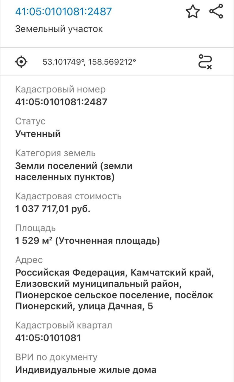 Кадастровый номер: 41:05:0101081:2487 (15 сот)