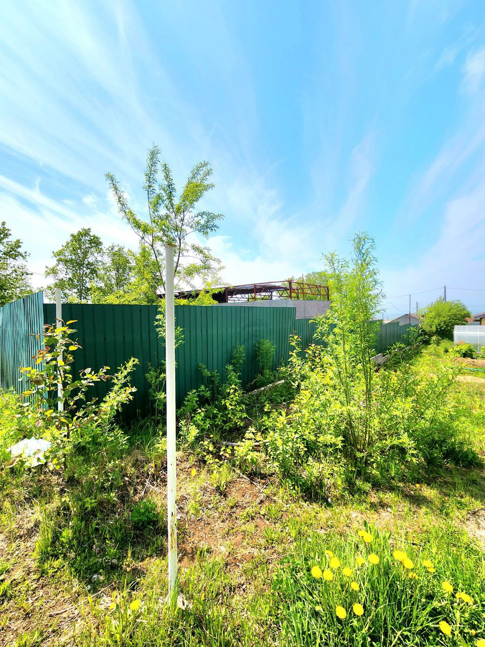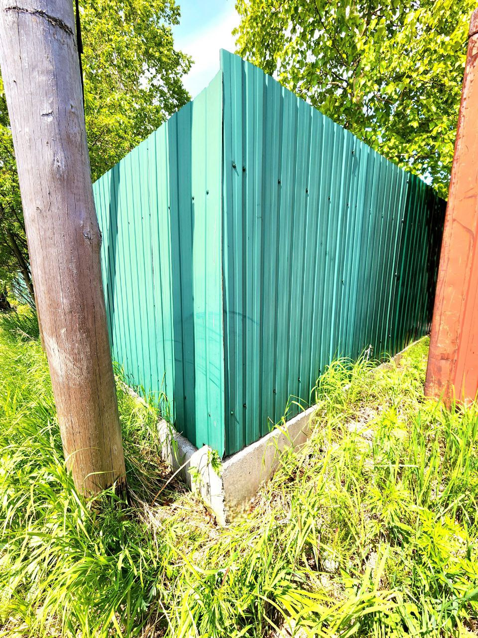 По всему периметру Участок огорожен забором из профнастила, установленным на ленточном фундаменте.