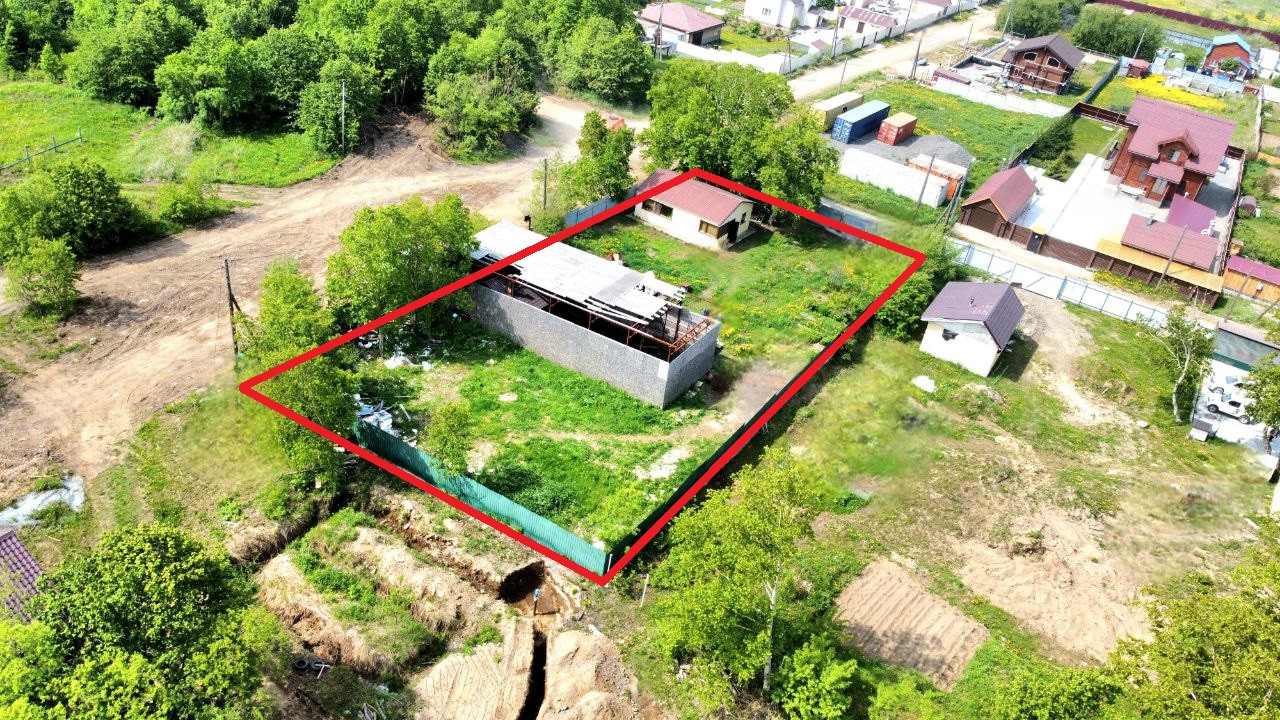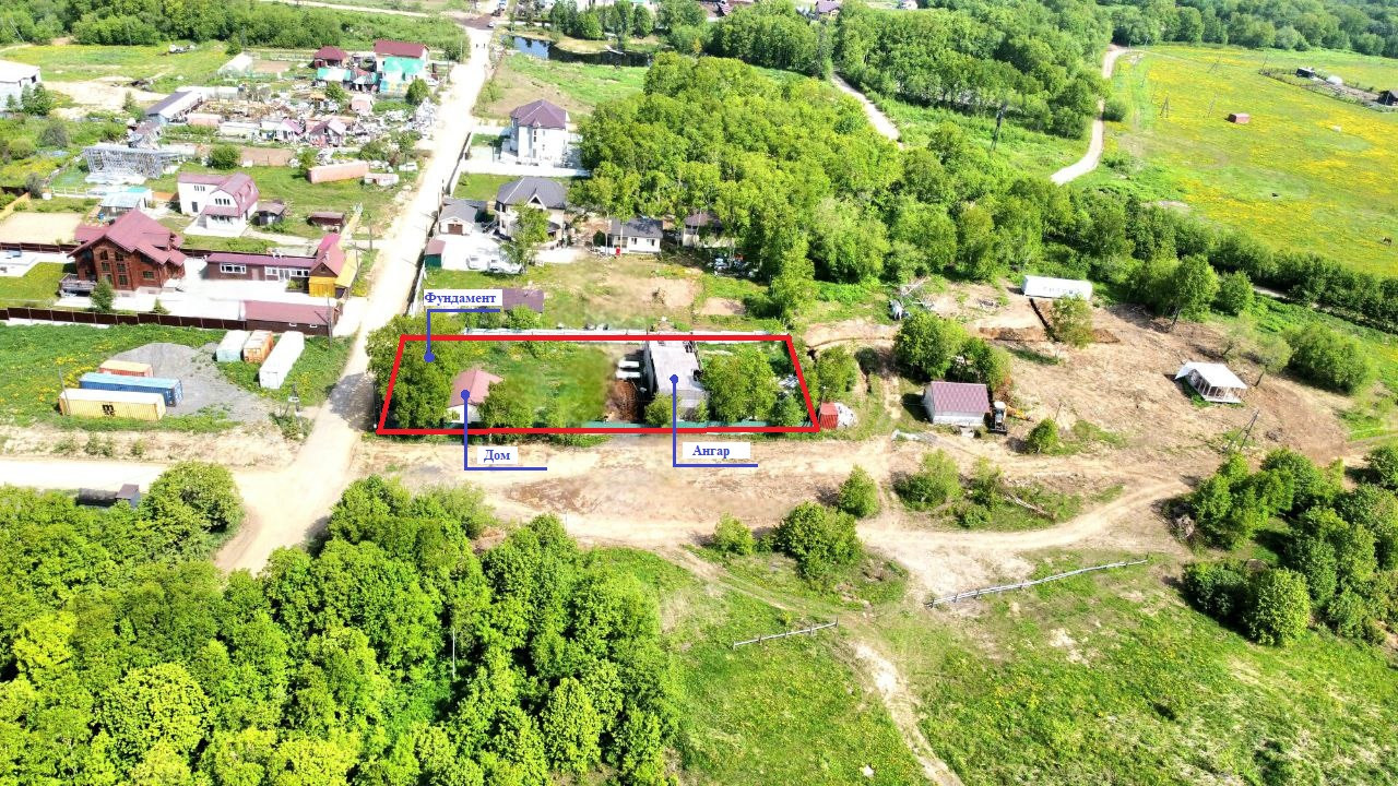 -  Фундамент 5м2 х 5м2 под баню либо любой вид строения. Ленточный по периметру + лента посредине, сверху залита плита 15 см. Не оформлен.