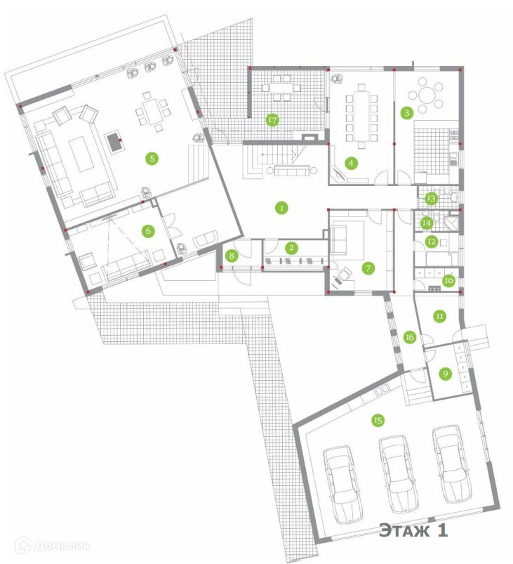 1 этаж: гостиная, кабинет, столовая, постирочная, гостевой с/у, гардероб, веранда, вестибюль, котельная, помещение персонала, с/у персонала, гараж на 3 м/м.