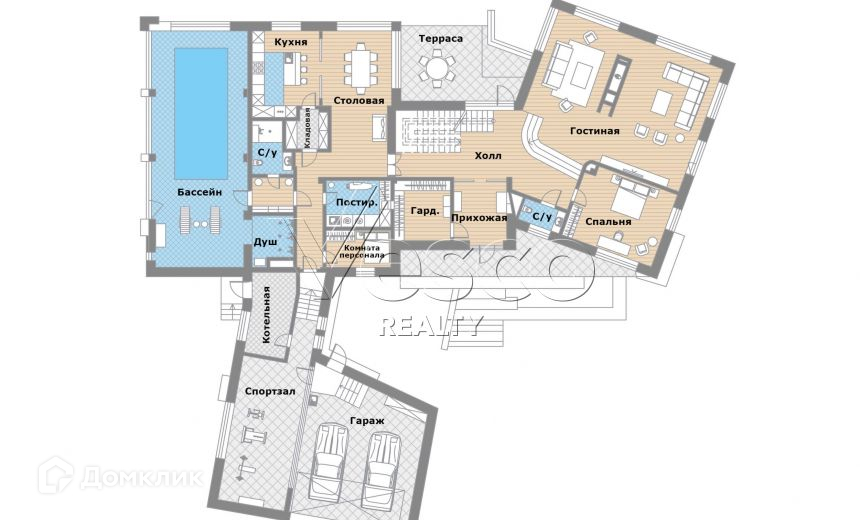 В доме бассейн, имеется полный проект дома с детальной проработкой всех элементов. На участке расположен гараж для 2 автомобилей.