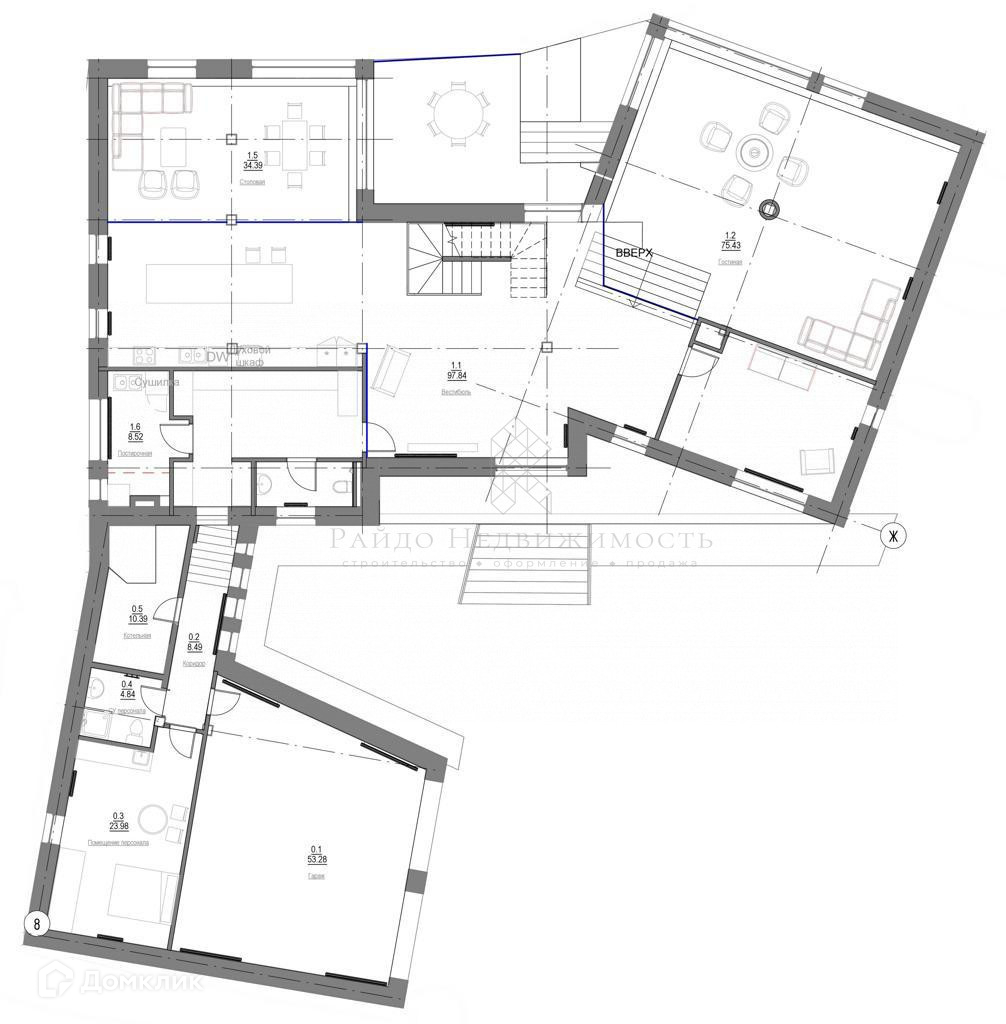 - Кухня-столовая с выходом на террасу – 54 кв.м