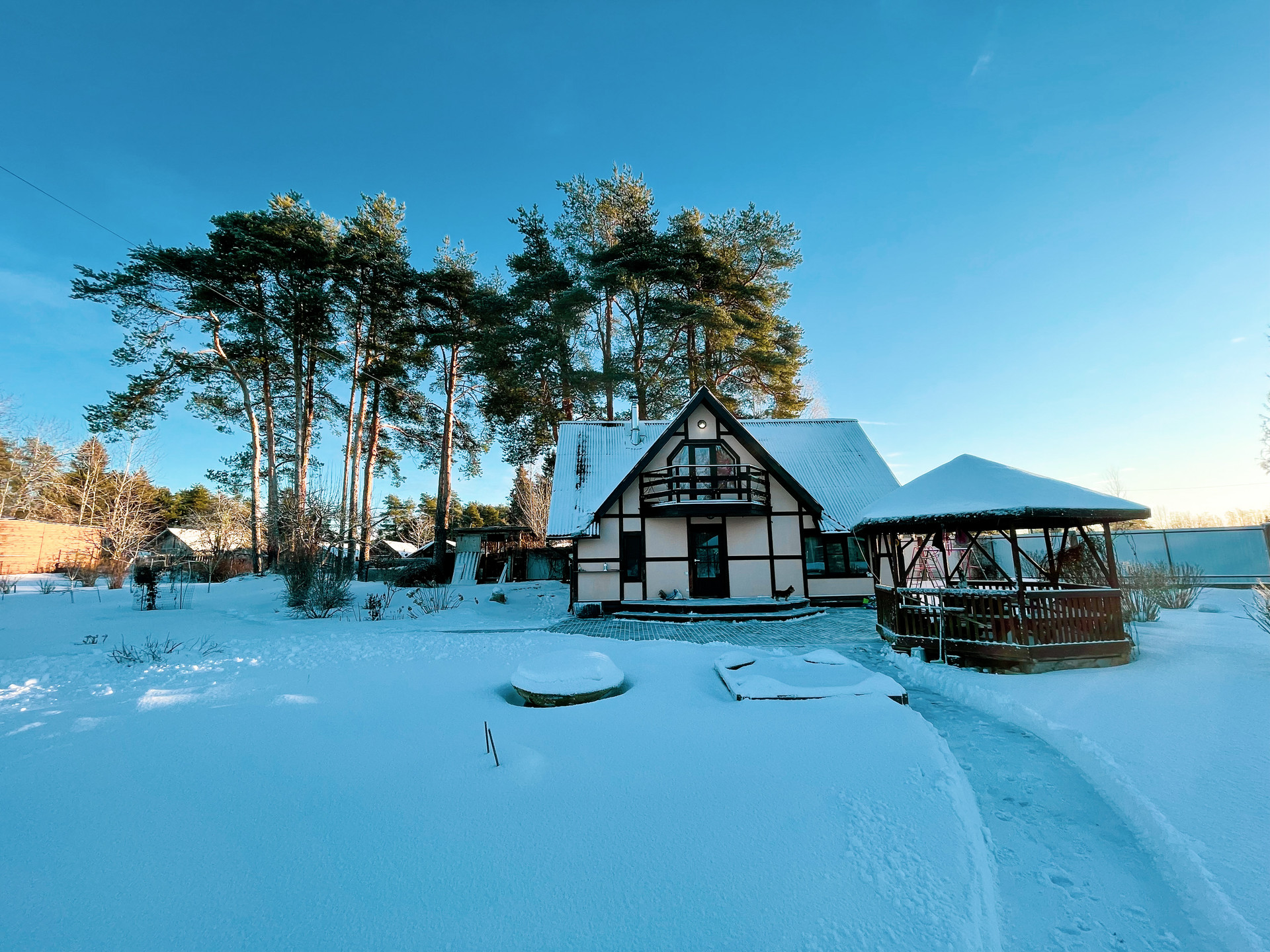 На территории есть уличная беседка, есть уличный(хотя зимой в нем тоже комфортно) туалет.