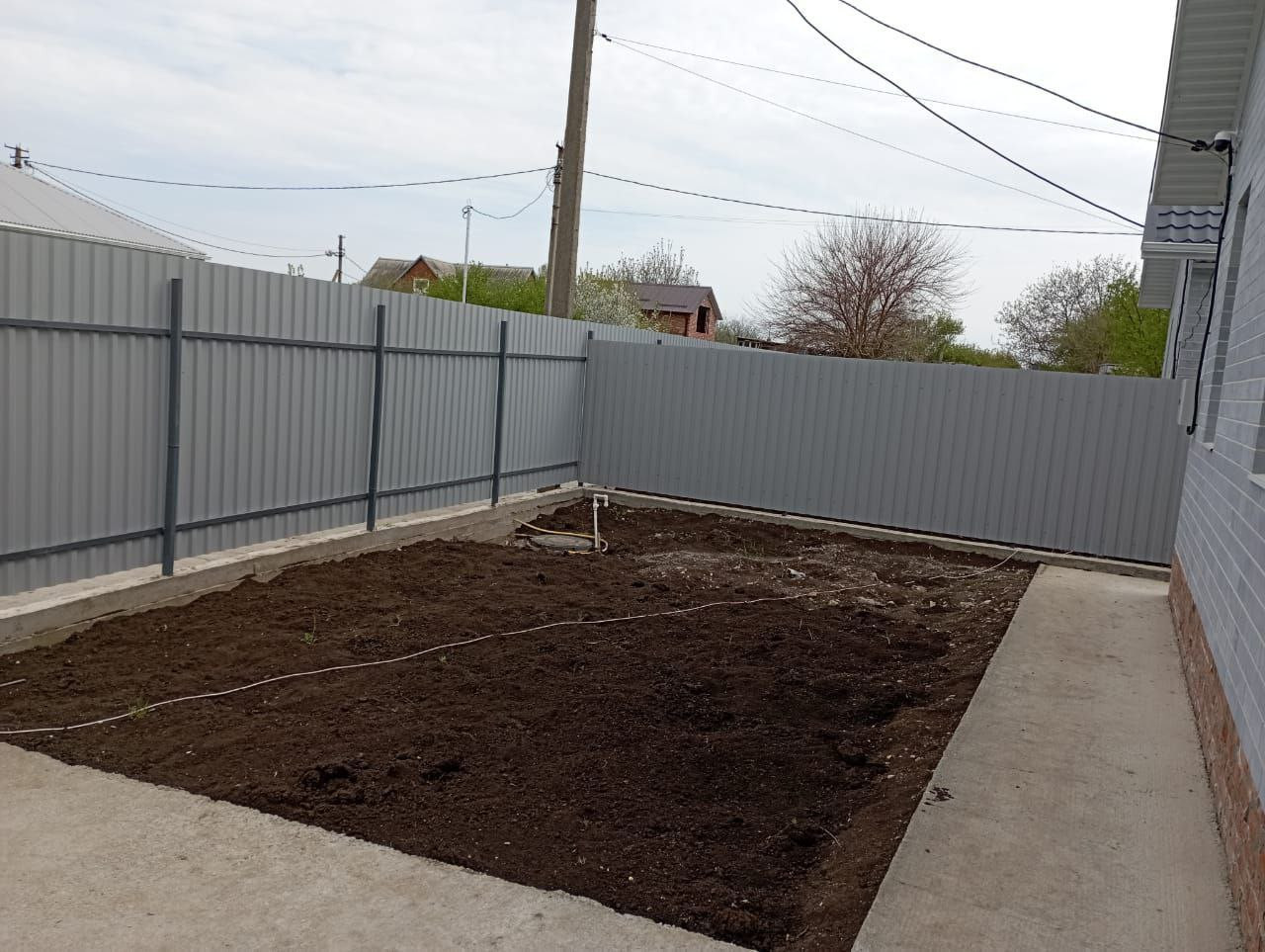 Въезд на 2 машины, откатные ворота. Участок огорожен забором.