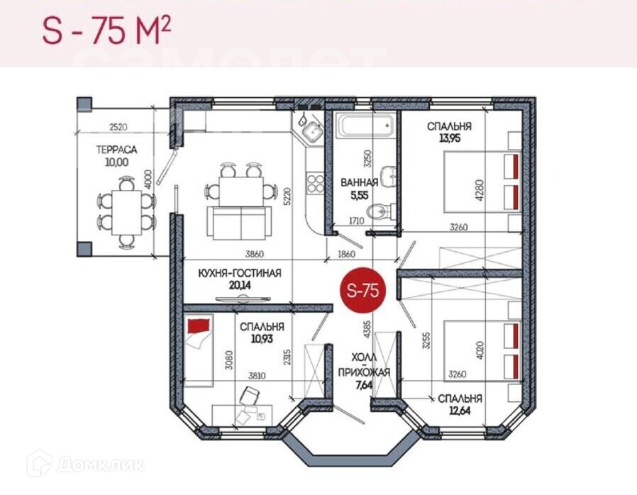 Общая площадь 75 м2