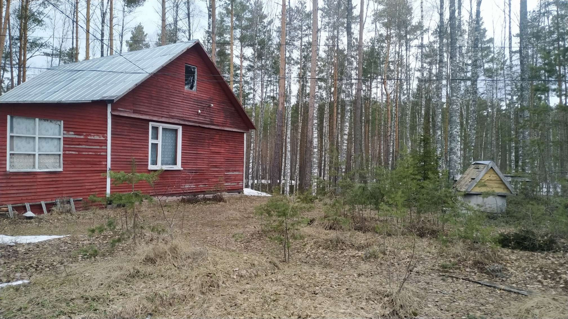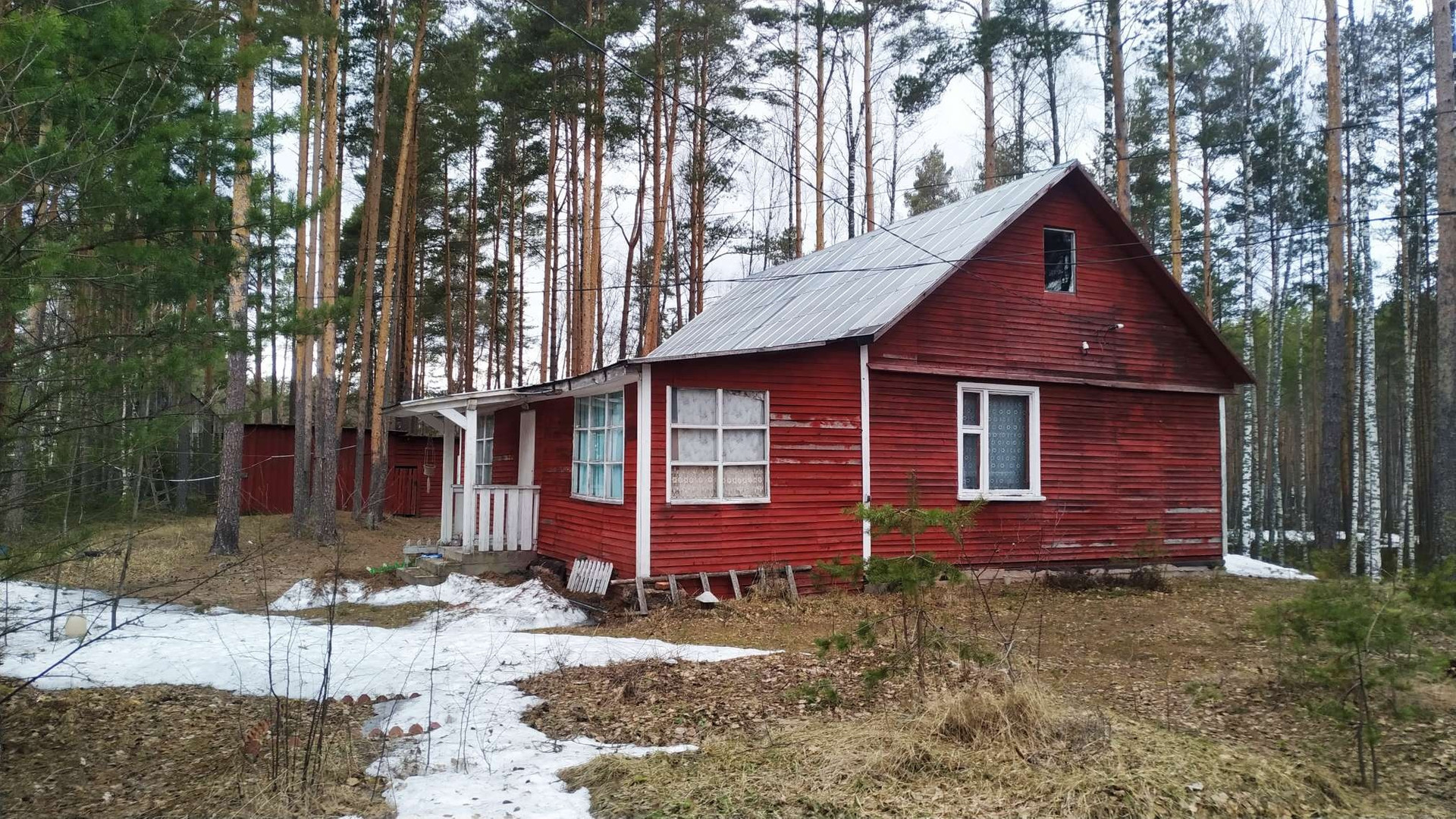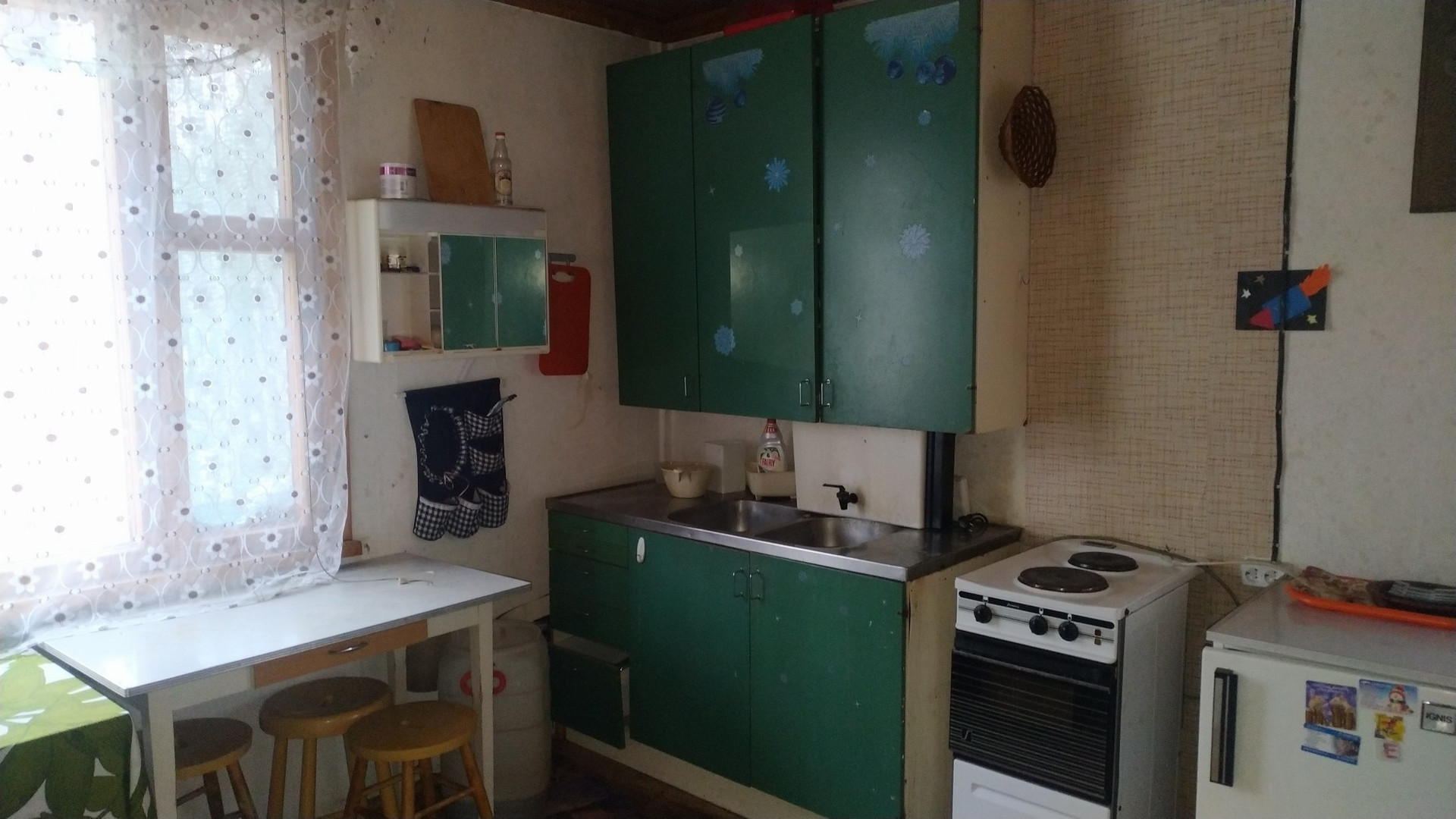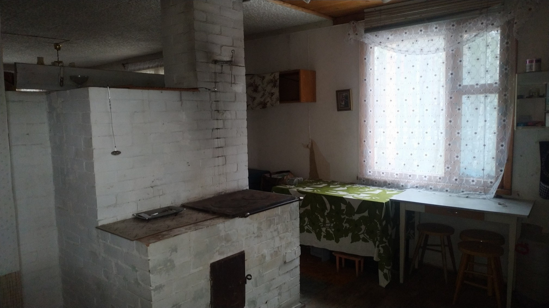 Дом одноэтажный, каркарный, обшит вагонкой, с двумя комнатами, большая русская дровяная печь отапливает дом. Застеклённая веранда, кладовка, кухня.