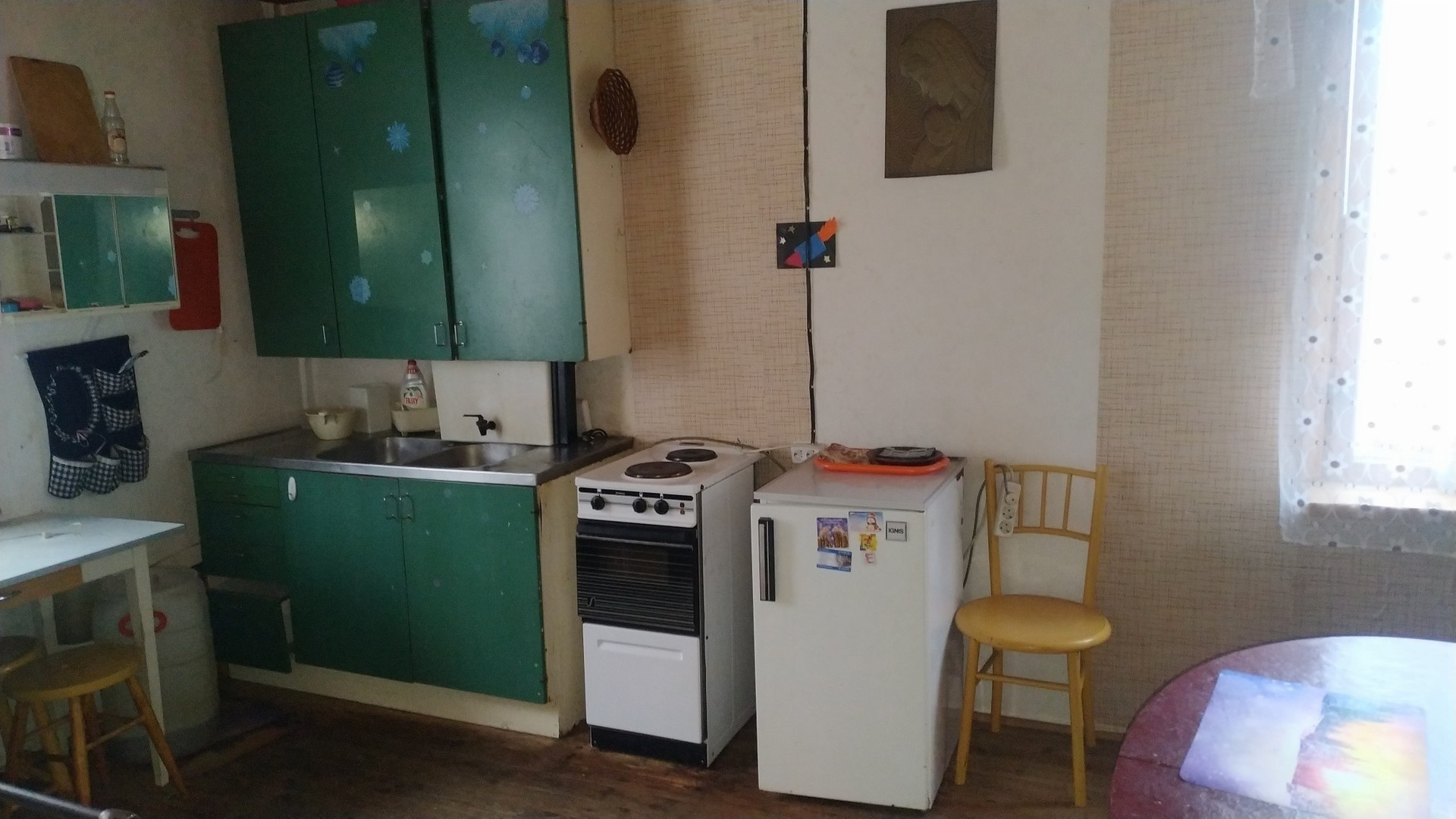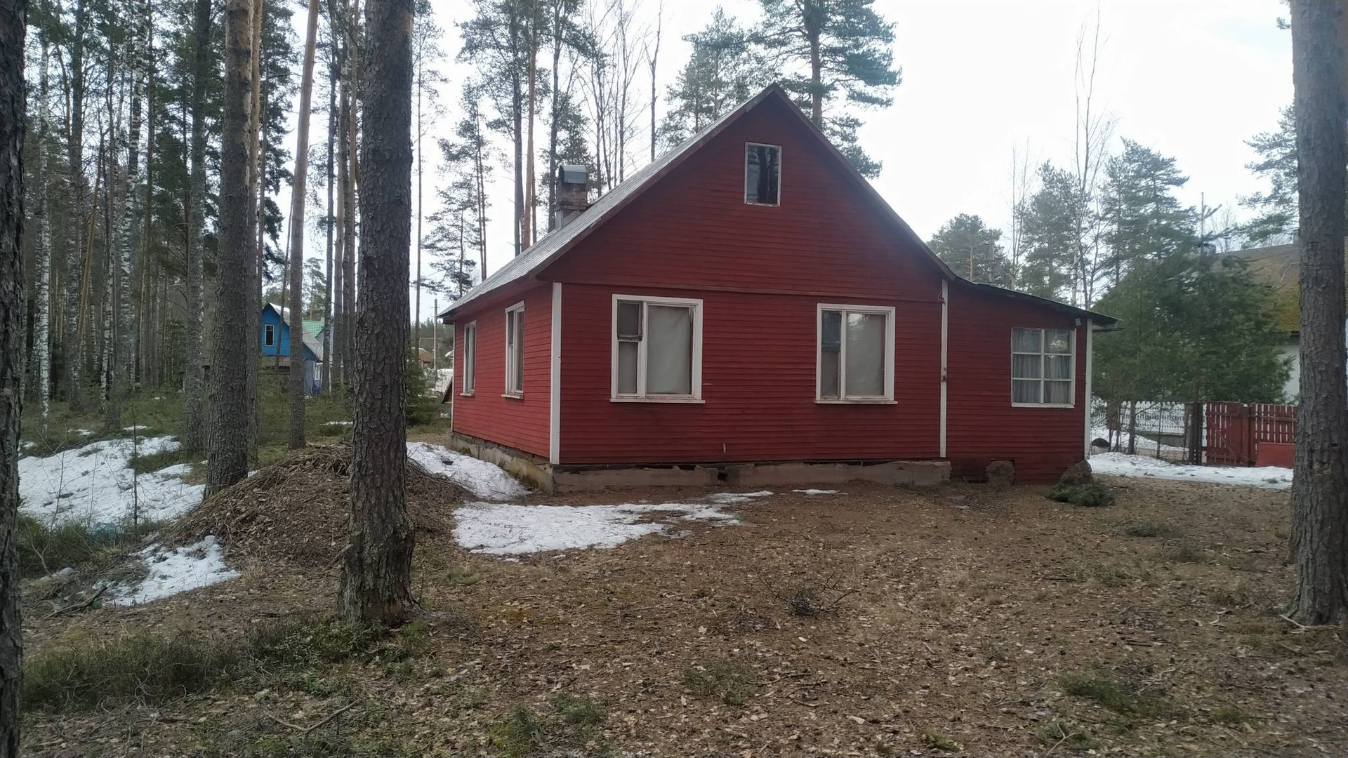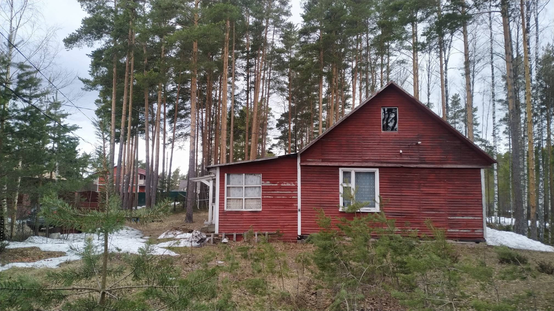 Дом одноэтажный, каркарный, обшит вагонкой, с двумя комнатами, большая русская дровяная печь отапливает дом. Застеклённая веранда, кладовка, кухня.