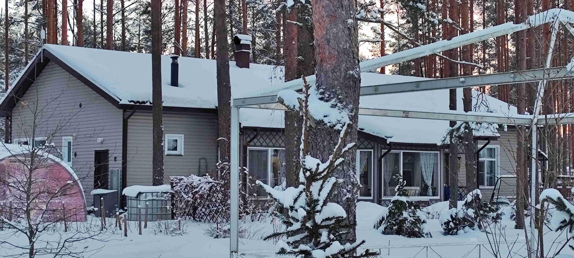 Одноэтажный коттедж, площадью 156 кв. м, расположен на плите фундаменте, газобетонные стены, снаружи обшиты финским сайдингом. Дом построен так, чтобы солнечный свет освещал все комнаты со всех сторон , создавая неповторимую душевную атмосферу в разное время суток. Центром притяжения хозяев и гостей дома является кухня-гостиная, площадью 51 кв. м, согревая всех солнечным светом, камином. По всему дому проведены теплые полы, кроме спален. Три уютные спальни (12+12, 5+14,3 кв. м) с окнами на две стороны, вместительная 7,2 кв. м гардеробная. Большой сан. узел с ванной. Банный комплекс с чугунной русской печью и удобными полками, кадка для обливания холодной водой. Душевая и туалет. Для полного релакса имеется турецкий хамам, выложенный мозаичной плиткой на восточный манер, со светящимся звёздным потолком, отапливается от парогенератора harvia , душ.