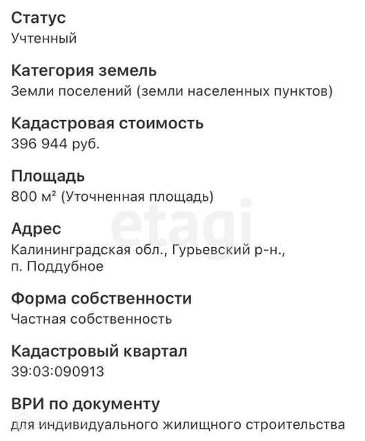 В продаже земельный участок в п. Поддубное, Гурьевского района Калининградской области, площадью 8 соток. Участок правильной ровный, сухой, правильной прямоугольной формы. Обременения отсутствуют. Есть возможность подключения света, газ проведут в этом году. Участок находится в 4 км от Калининграда. Школа в п. Яблоневка ( возит школьный автобус) и школа 56 ул. Кармазина ( маршрут 159). Окружная дорога в любом направлении, до Калининграда на машине-5 мин. С Федеральной компанией Этажи, Вы можете не только купить земельный участок, но и построить дом. Помощь в оформлении ипотеки, даже на стройку.