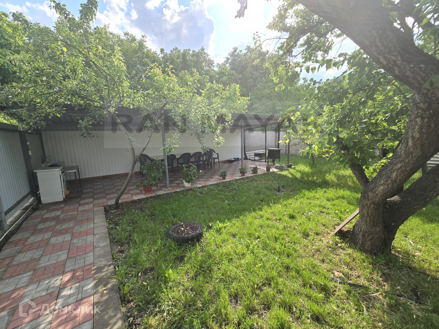 постройки, зона барбекю и отдыха в глубине двора.