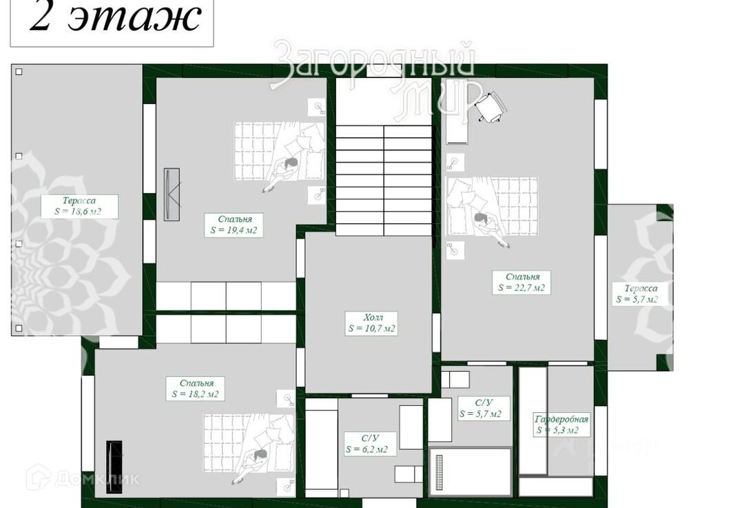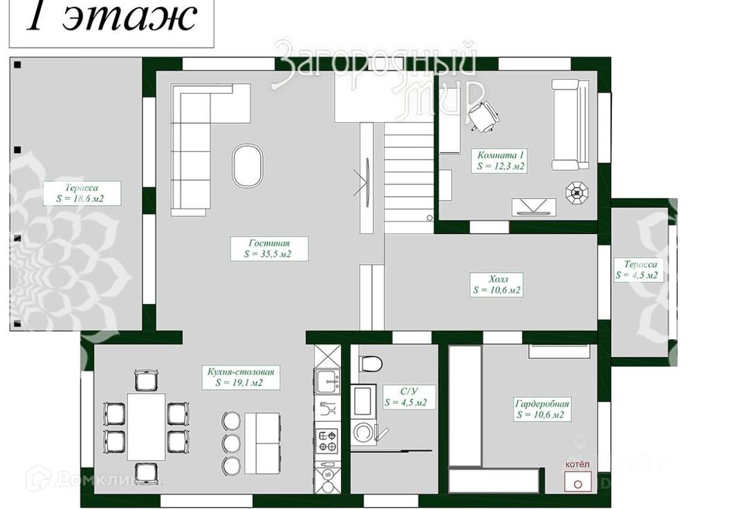 В доме запланированы: на 1-м этаже - прихожая, гостиная, кухня-столовая с выходом на террасу, спальня (кабинет), бойлерная/гардеробная, с/у; на 2-м этаже - мастер-спальня с гардеробной и с/у, 2 спальни, с/у, терраса, балкон.