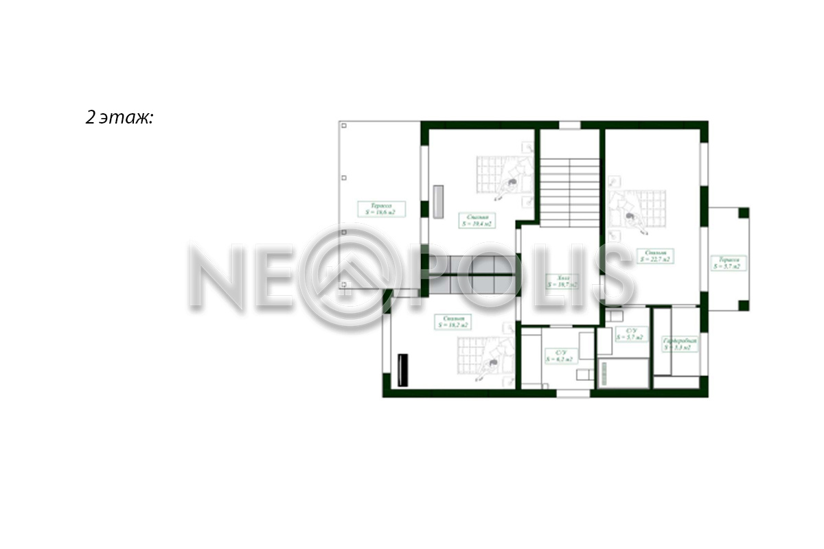 2 этаж: холл, мастер спальня с гардеробной, ванной комнатой и балконом, спальня с балконом, спальня, санузел.