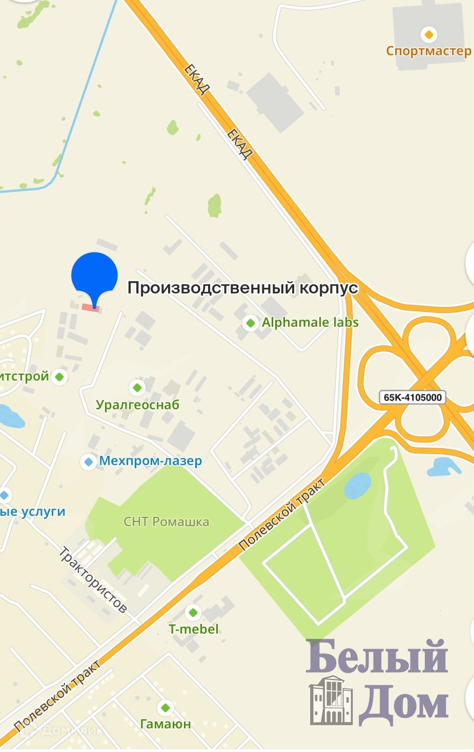 Здание расположено рядом с развязкой Полевского тракта и ЕКАД, в районе технопарка Полеводство.