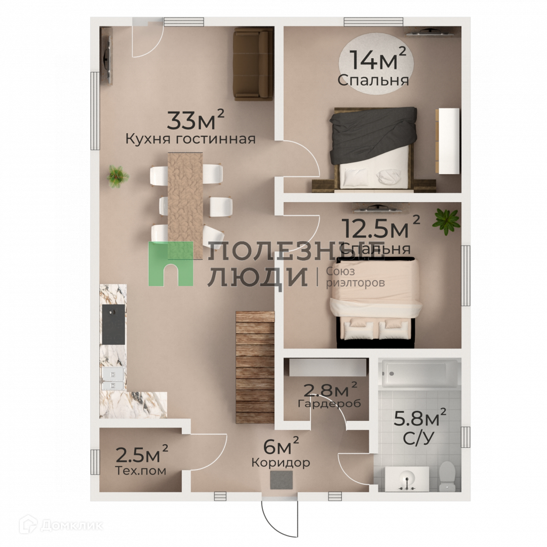 Кухня-гостинная + 2 спальни.