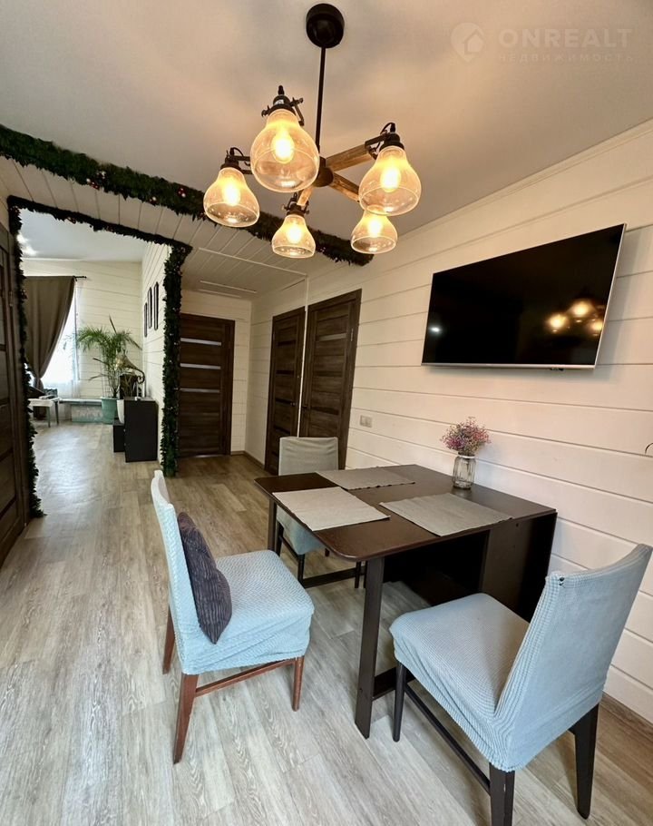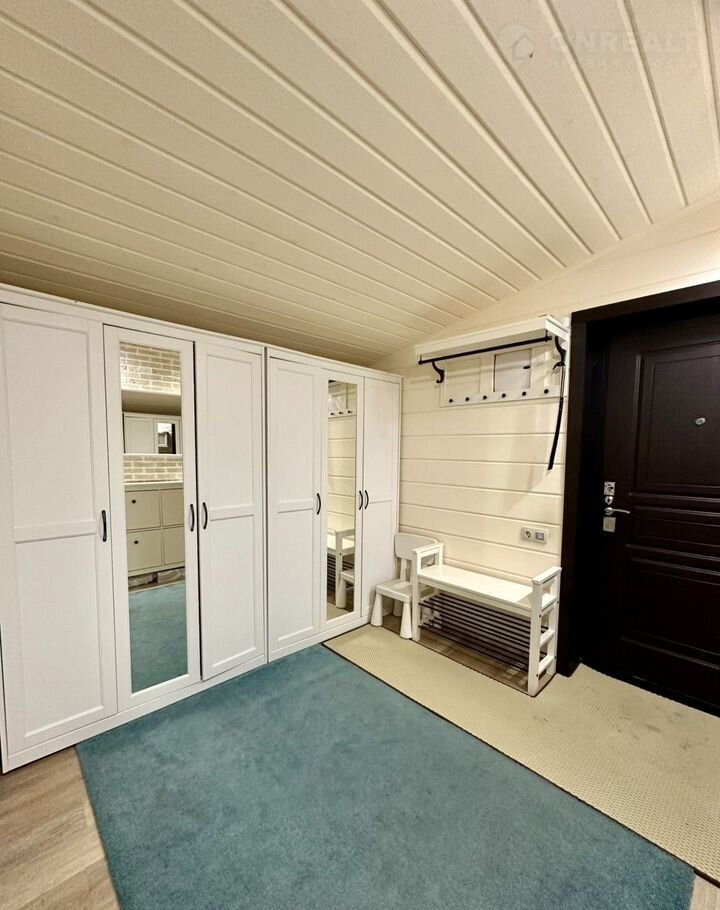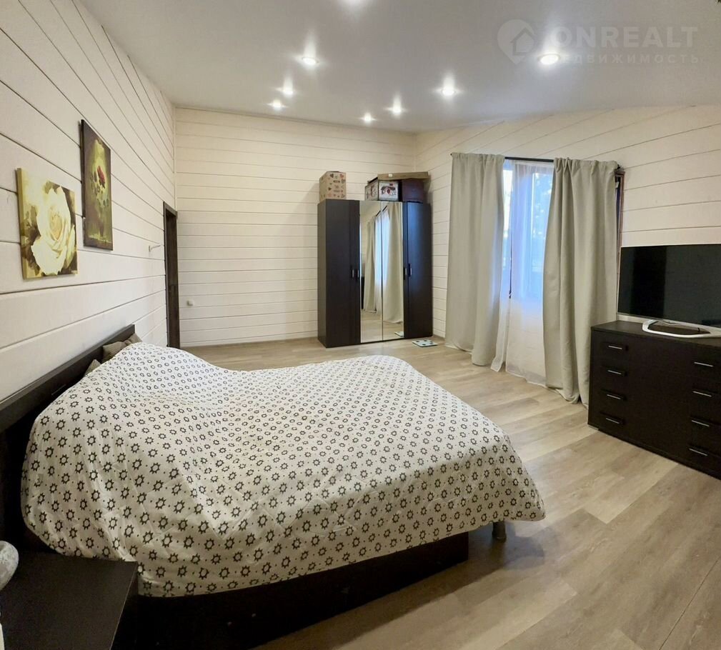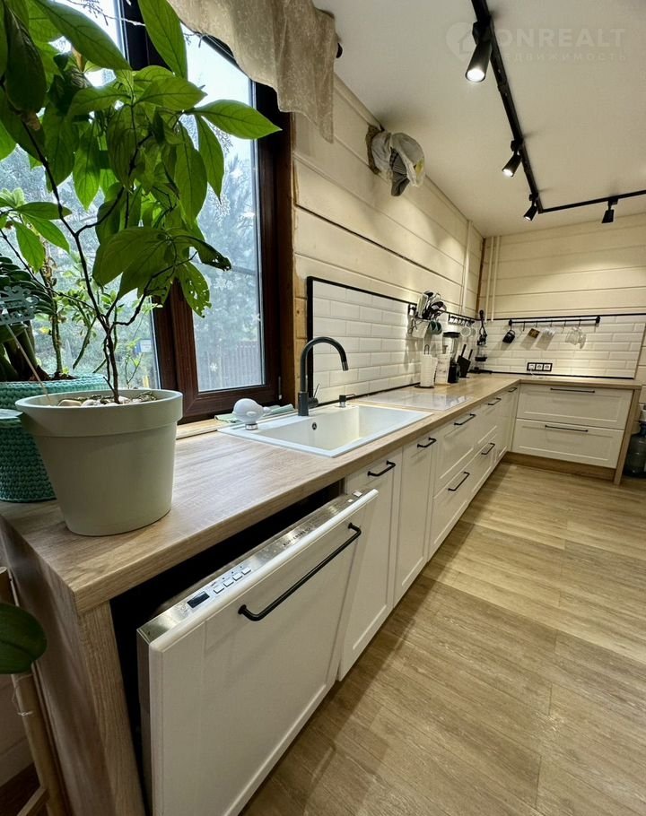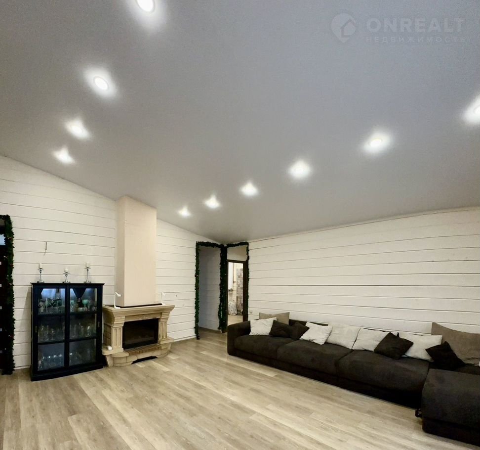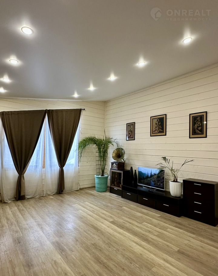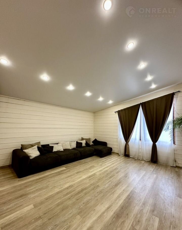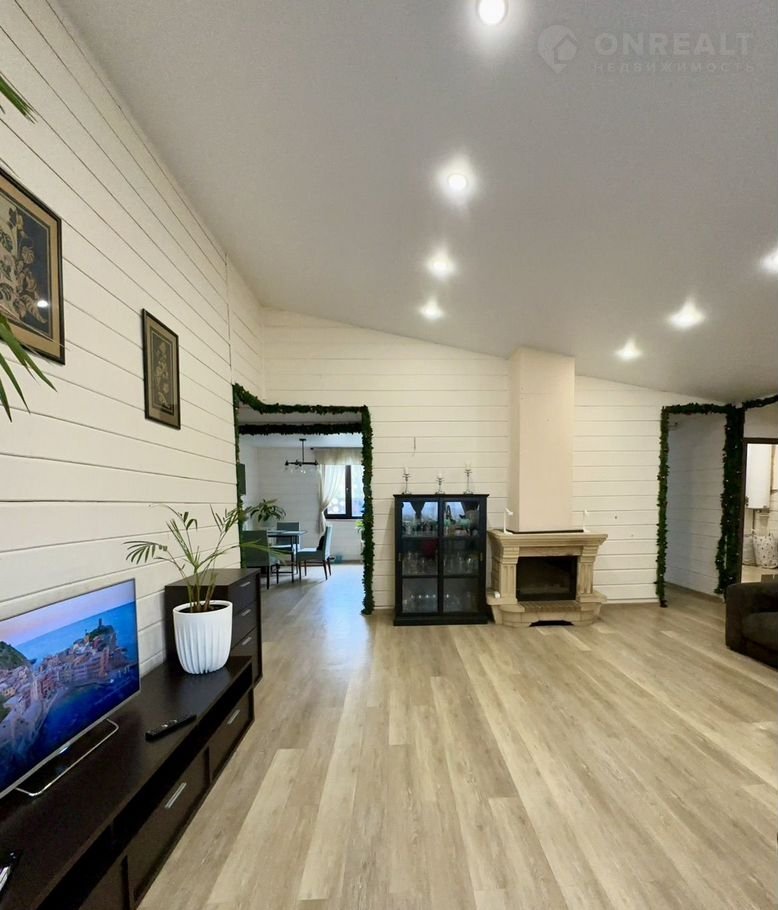 В доме на первом этаже расположена просторная гостиная (33 кв.м) с камином, кухня (27,1 кв.м), оснащенная встроенной техникой (два холодильника, духовой шкаф, посудомоечная машина, микроволновая печь, варочная панель), две комнаты (14 кв.м и 23,2 кв.м), совмещенный санузел (11 кв.м), отдельный санузел, гардеробная, прихожая. На втором этаже единое пространство 27 кв.м (возможно сделать комнату). Эргономичная планировка дома, большие окна «в пол» делают его комфортным и удобным для жизни. В доме сделан качественный евро ремонт. Вся мебель и техника высокого качества остается в доме.