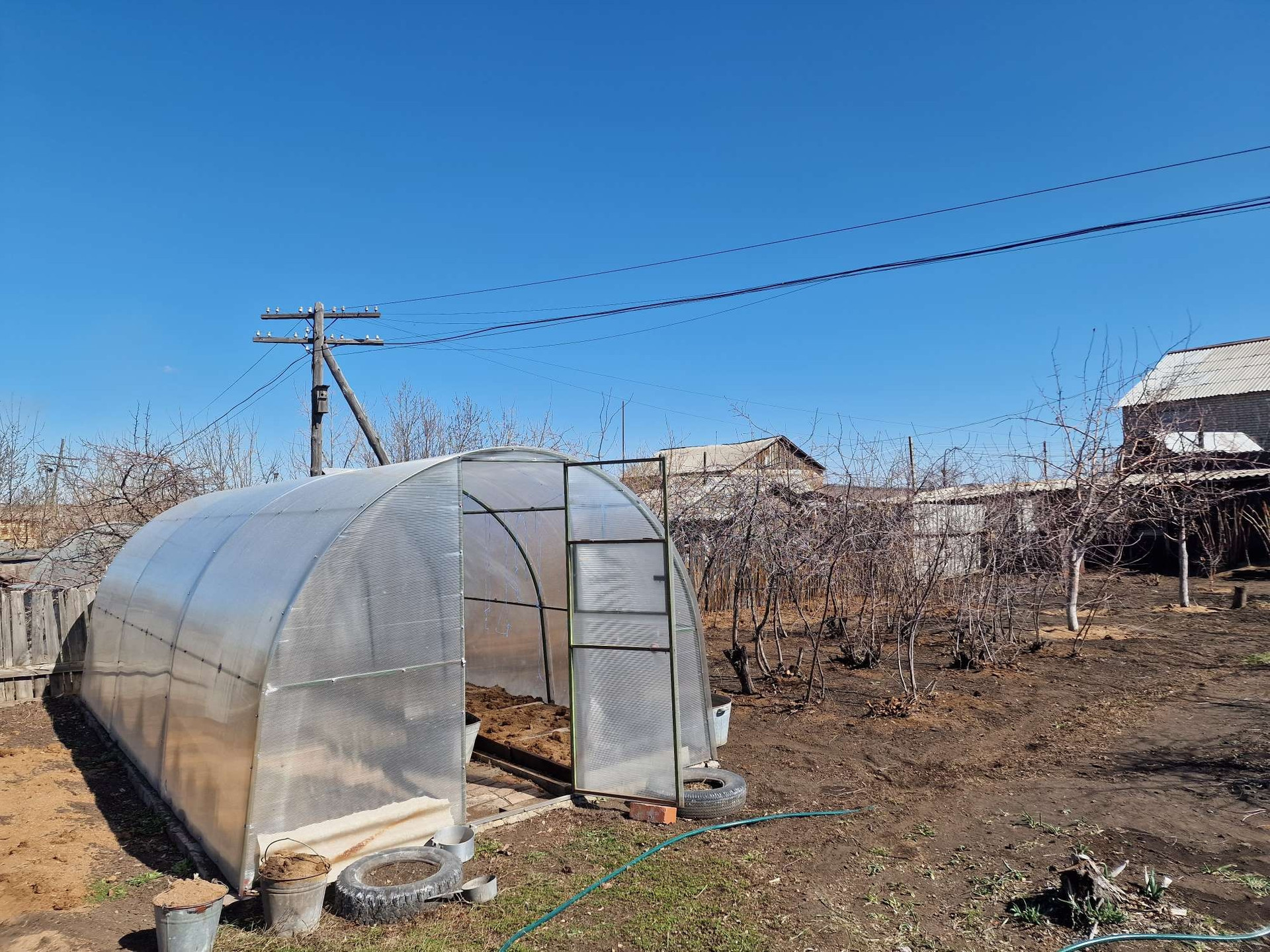 Ухоженный участок: новая теплица, посадки: малина, плодовые деревья, смородина, вода для полива.