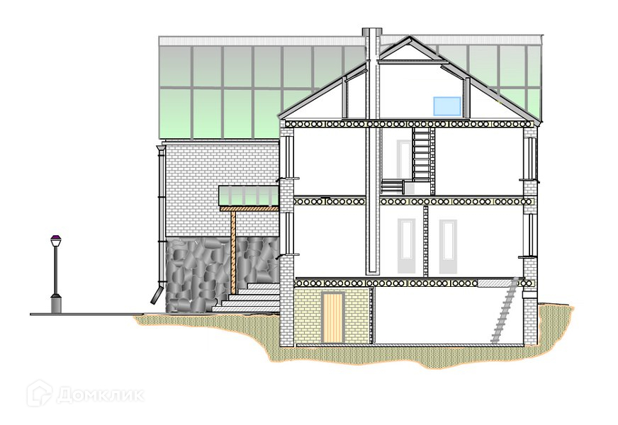 Планировка дома включает в себя несколько спален, просторную гостиную, кухню, санузел, кабинет и другие помещения. В доме в цокольном этаже располагается гараж, сауна. На участке также имеется хозяйственная постройка.