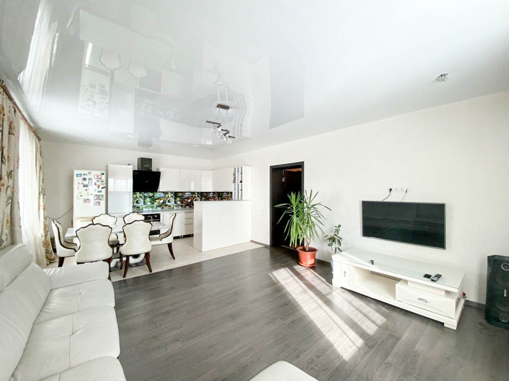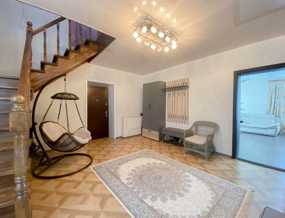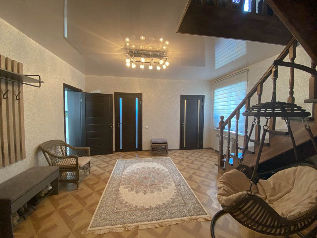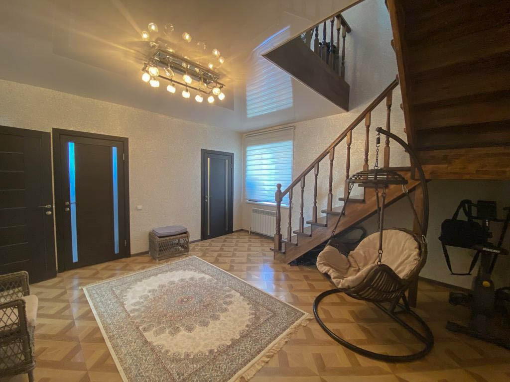 На первом этаже находится: Большая кухня - гостиная 34,2 кв.м.. Кухонный гарнитур выполнен в современном стиле со встроенной и всей необходимой дорогой бытовой техникой (варочная электропанель, духовой шкаф, посудомоечная машина, вытяжка, холодильник). Прихожая 18,6 кв.м. Гостевой с/у совмещен и выложен керамической плиткой, установлена новая сантехника. Котельная с отдельным выходом во двор. Лестница на второй этаж выполнена из дерева.