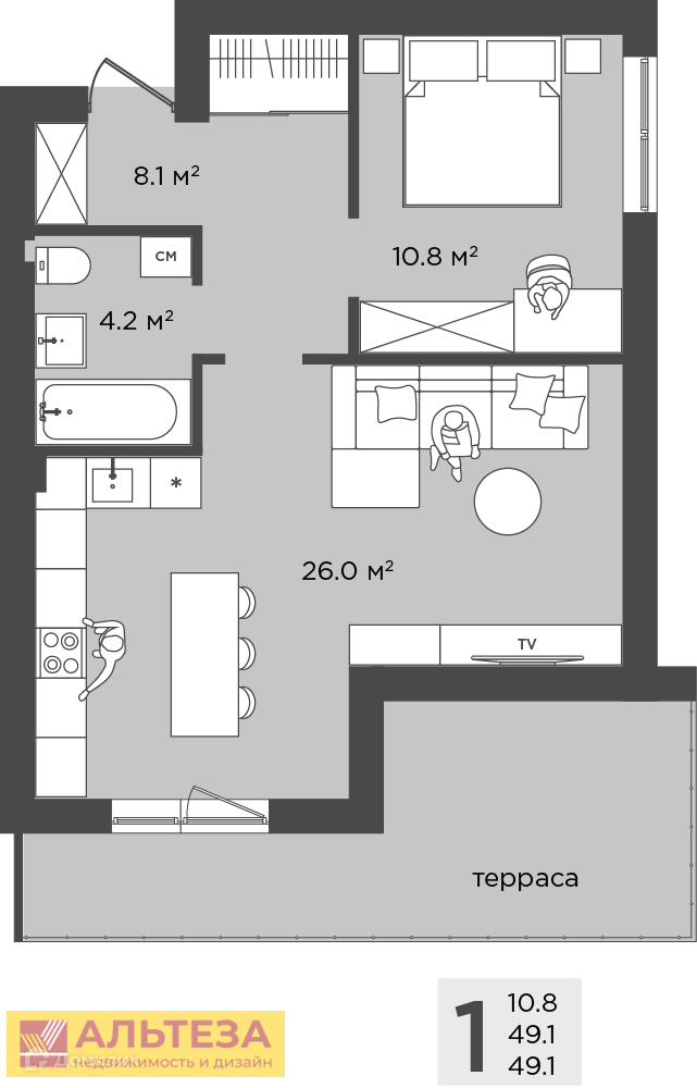 Продается 1 комнатная квартира с автономным отоплением на 1 этаже 4 этажного дома в ЖК «Palmburg» . Общая площадь 49,1 кв.м. жилая площадь 10,8 кв. м , комната 10,8 кв.м., кухня-гостиная 26 кв. м, с/у совмещенный , балкон..