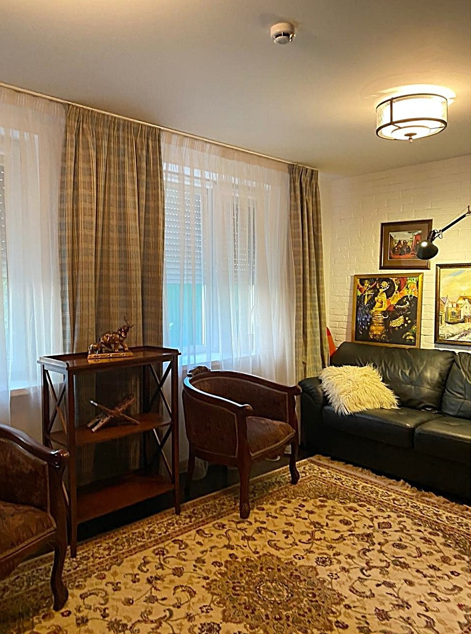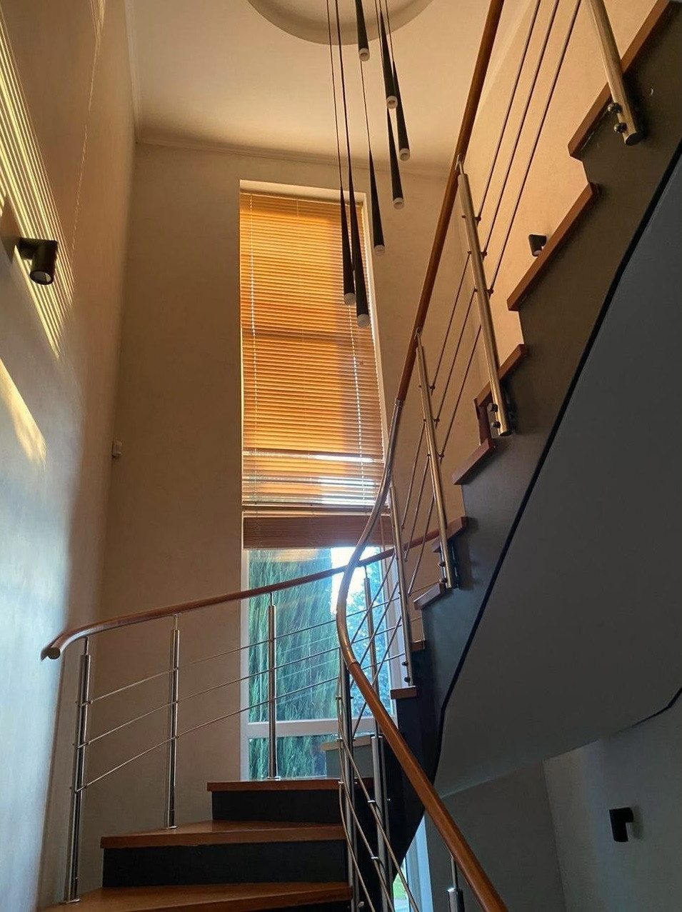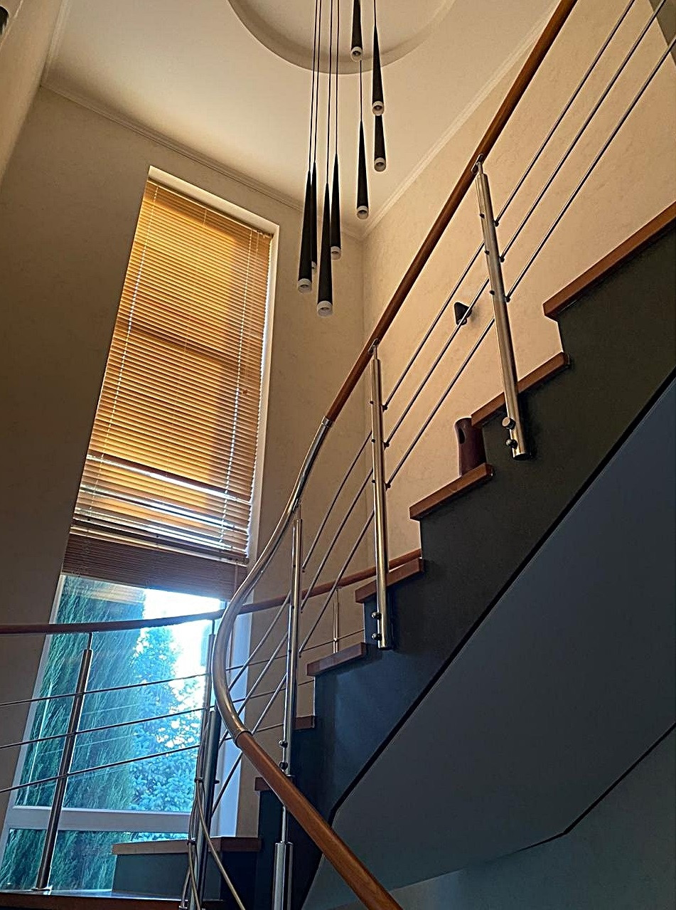 Два наземных этажа и один цокольный для хозяйственных нужд, четыре спальни, гостиная с переходом в кухню-столовую и отдельным выходом на участок, необычная планировка с зонированием и красивая комфортная для подьема лестница.