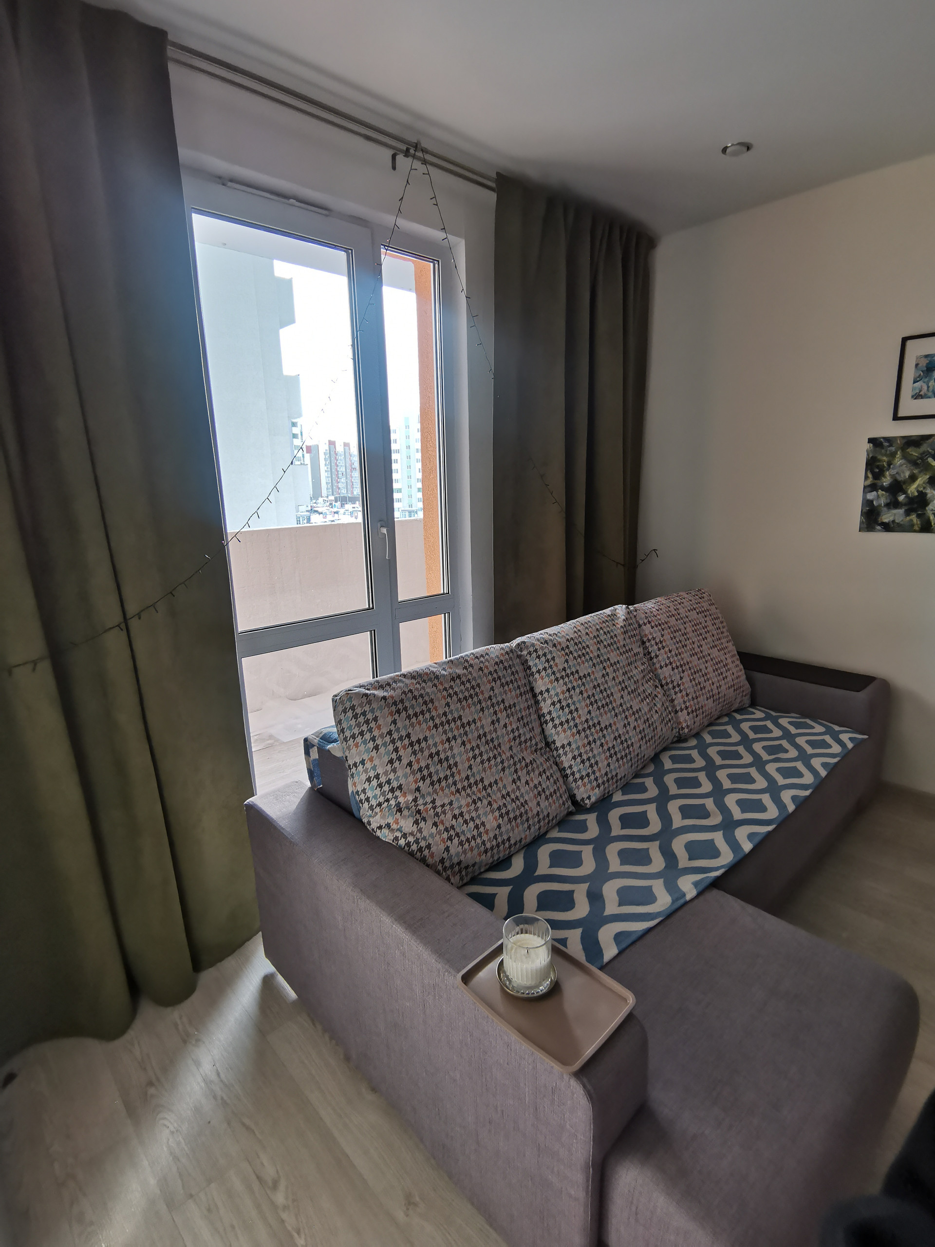 Большой балкон(не застеклен), окна выходят на бок одного дома, что хорошо, тк никто точно не будет пялиться вам в окно. Но есть и боковые виды, фото закатов с балкона прикрепила