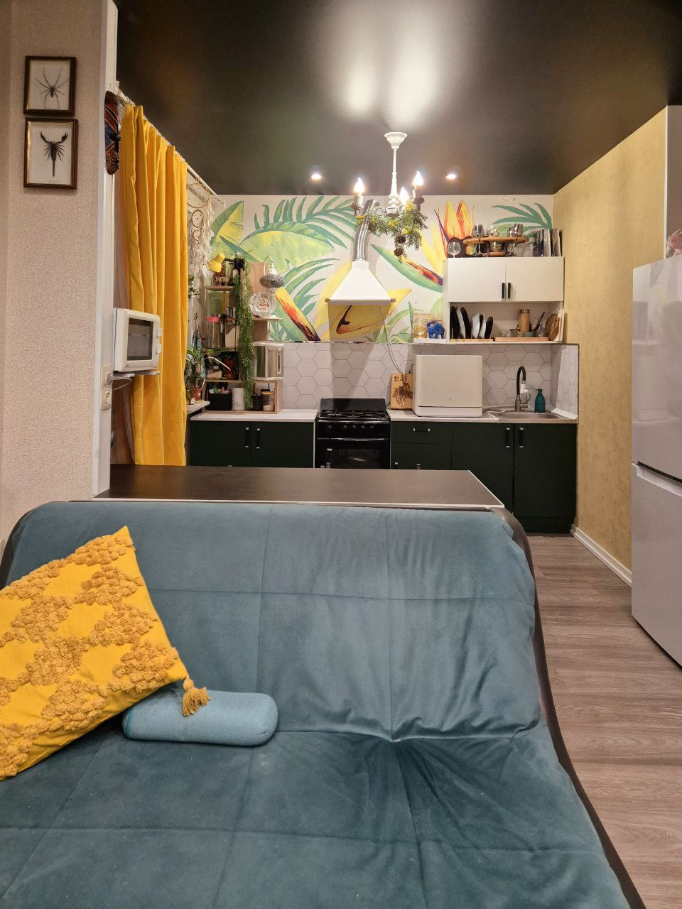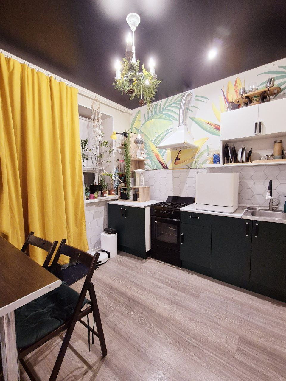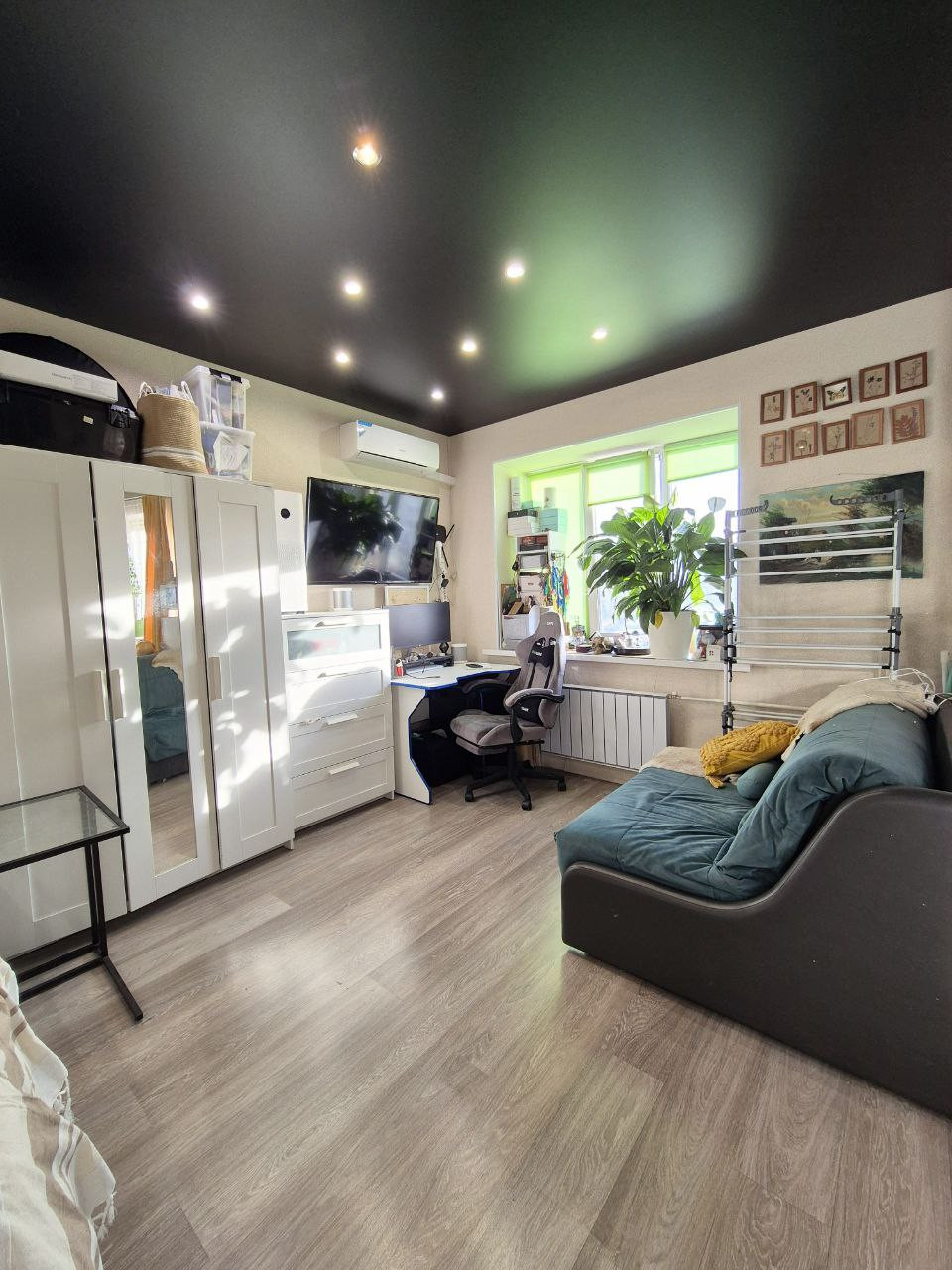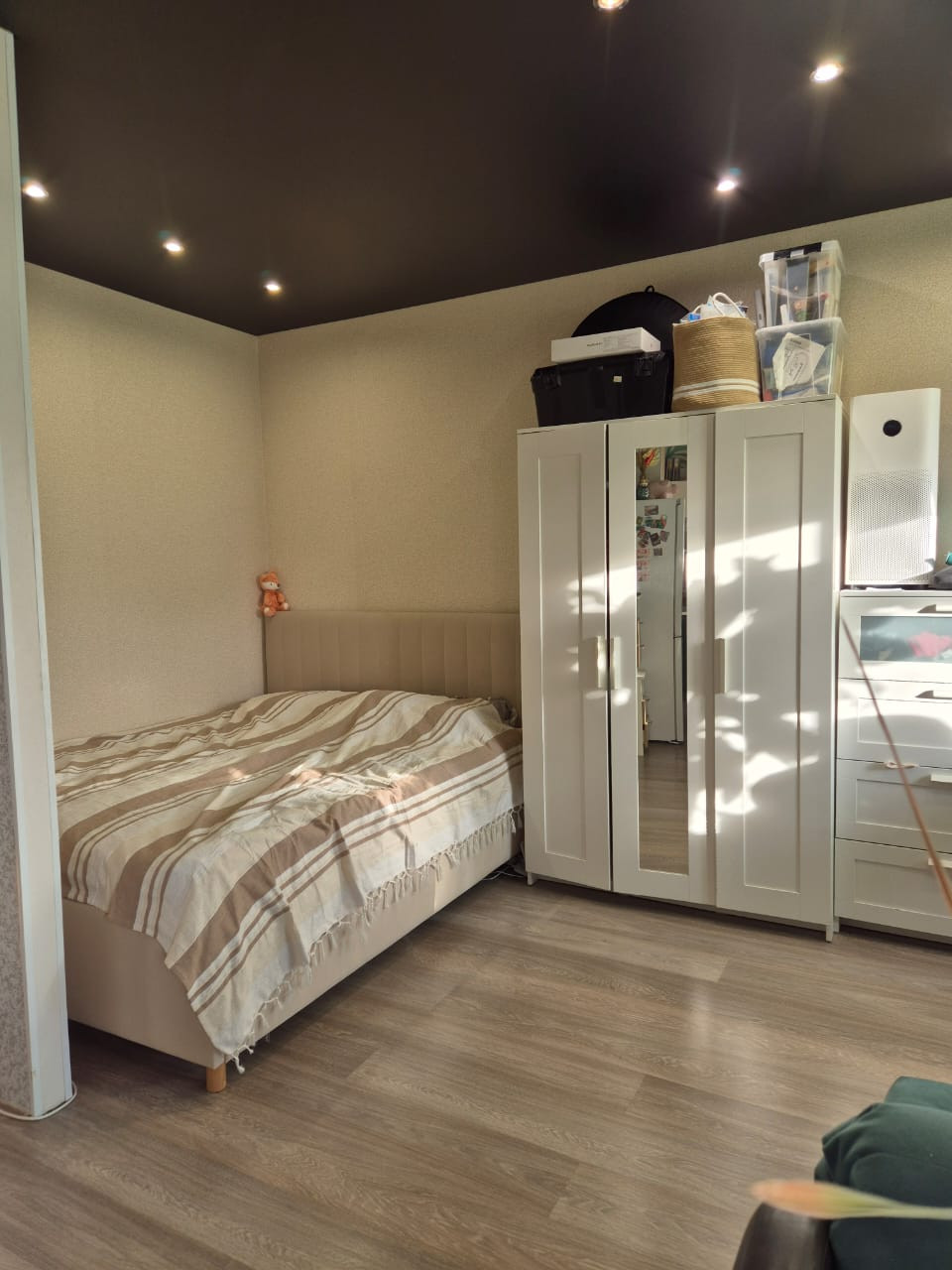 Светлая интересная квартира с чёрными дорогими потолками под кожу. Переделана в студию, ощущается простор помещения. Состояние: можно заехать и сразу жить. Большой открытый балкон с видом на набережную и на ледовый дворец, очень красивый вид из окна.