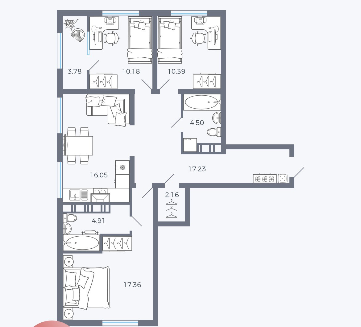 Квартира выходит на 3 стороны. Отличная планировка. Квартира очень теплая и светлая. Два санузла, один в мастер-спальне. Гардеробная. Зимний сад (лоджия). И что немаловажно - в квартире очень приятная атмосфера и энергетика (при покупке были в такой же квартире на 10 этаже - вообще другие впечатления, наша какая-то добрая и светлая).