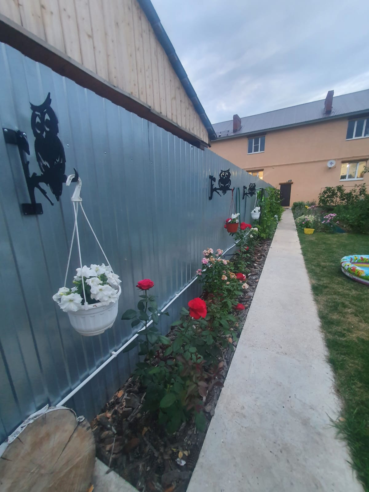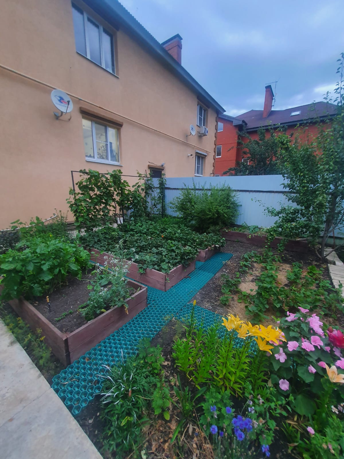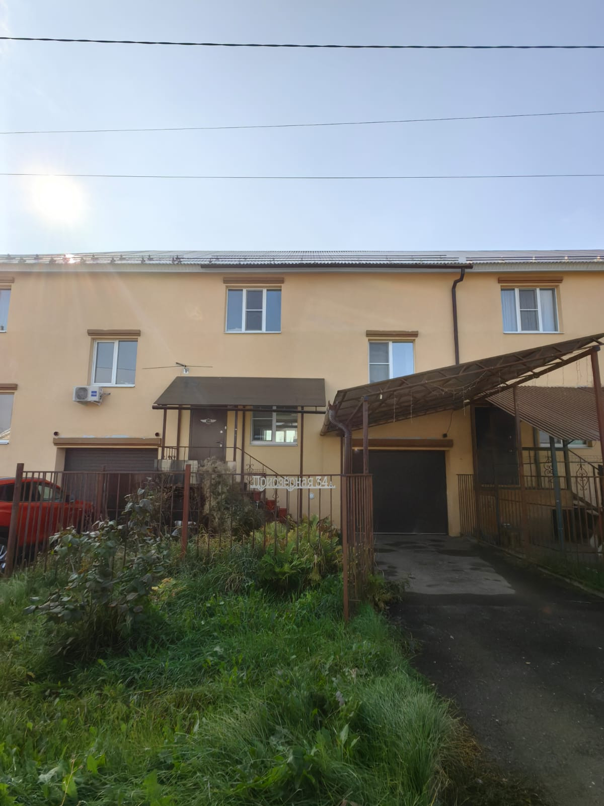 Передняя часть дома огороженная, асфальтированная крытая парковка, вольер, крыльцо, небольшой участок газона с декоративными насаждениями (многолетники). Есть большой тёплый гараж, в гараже есть вход в подвал 41 кв.м.