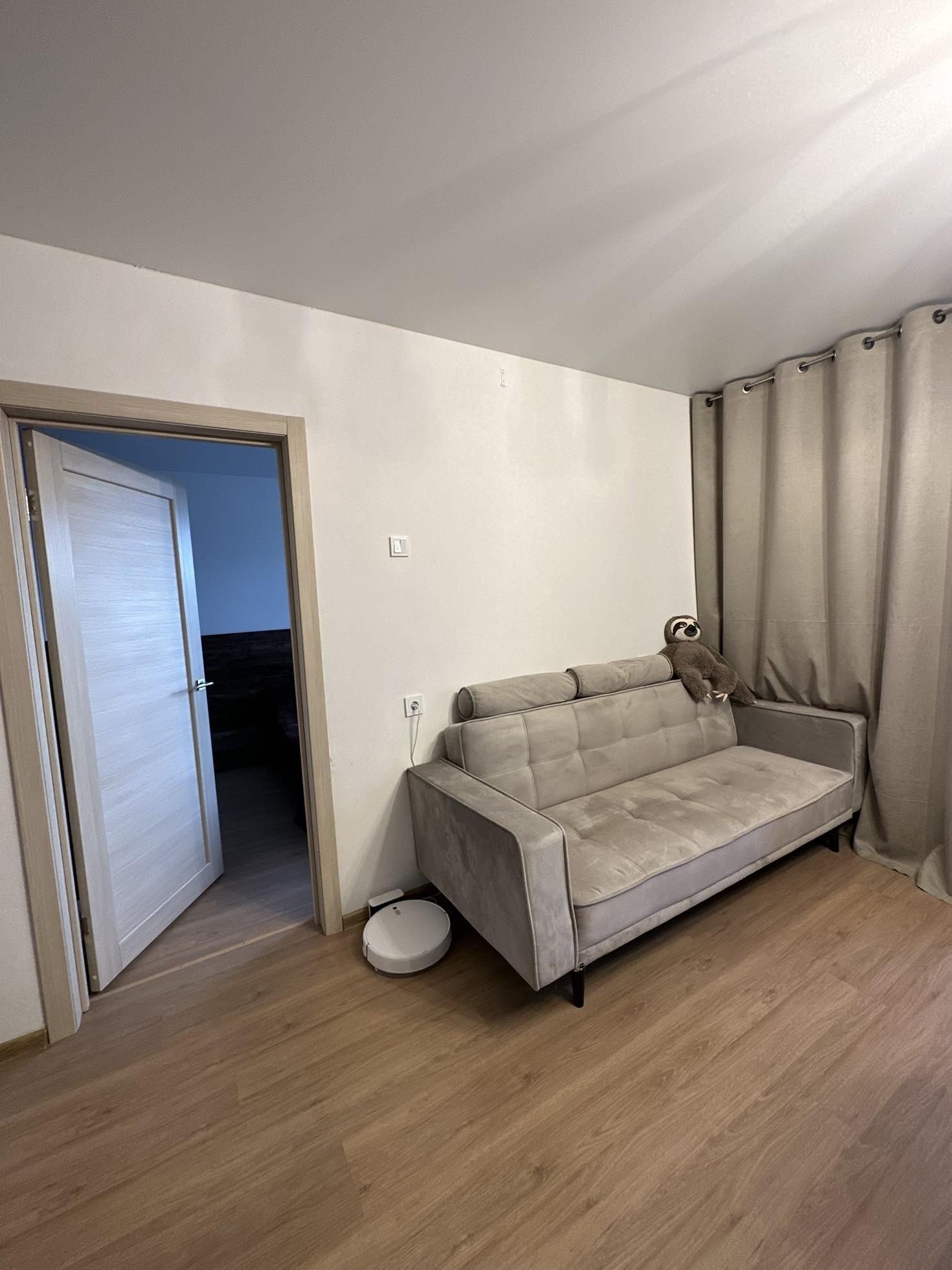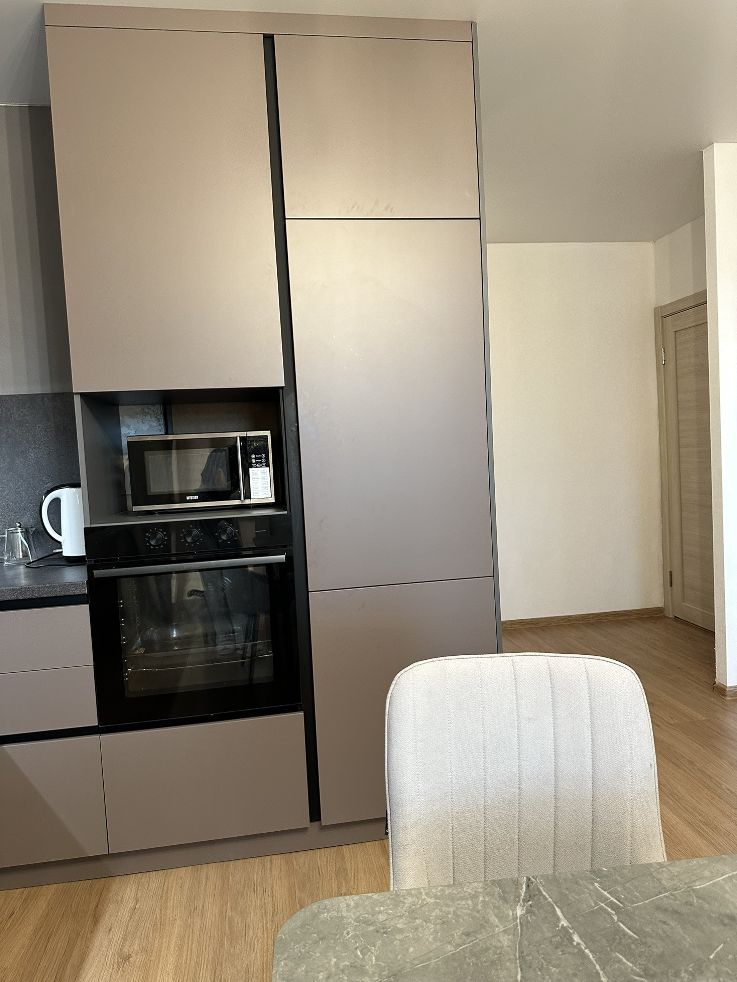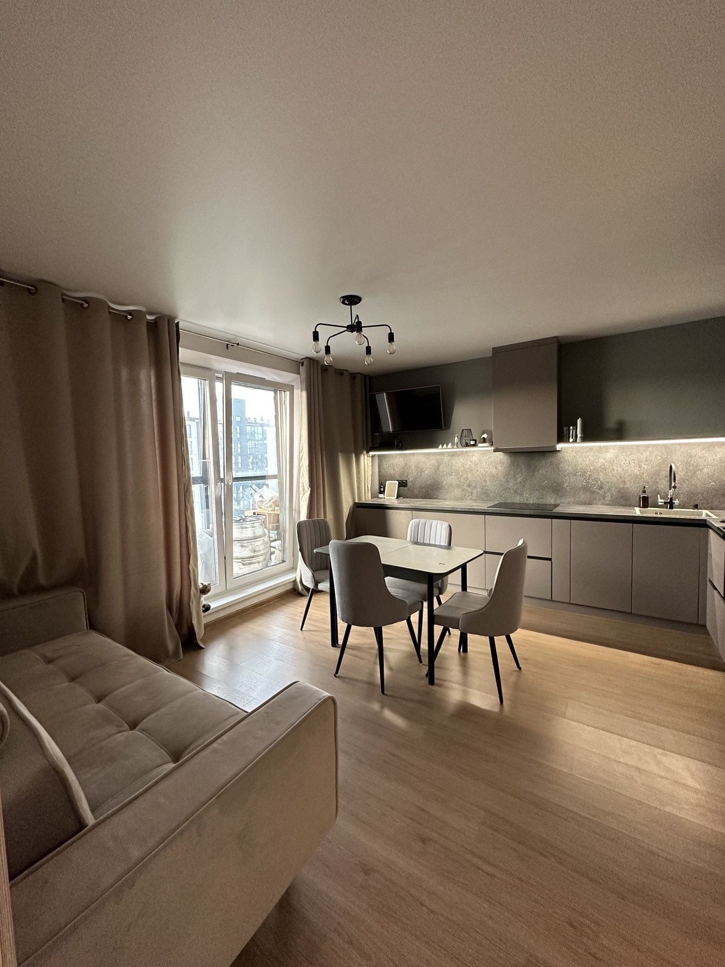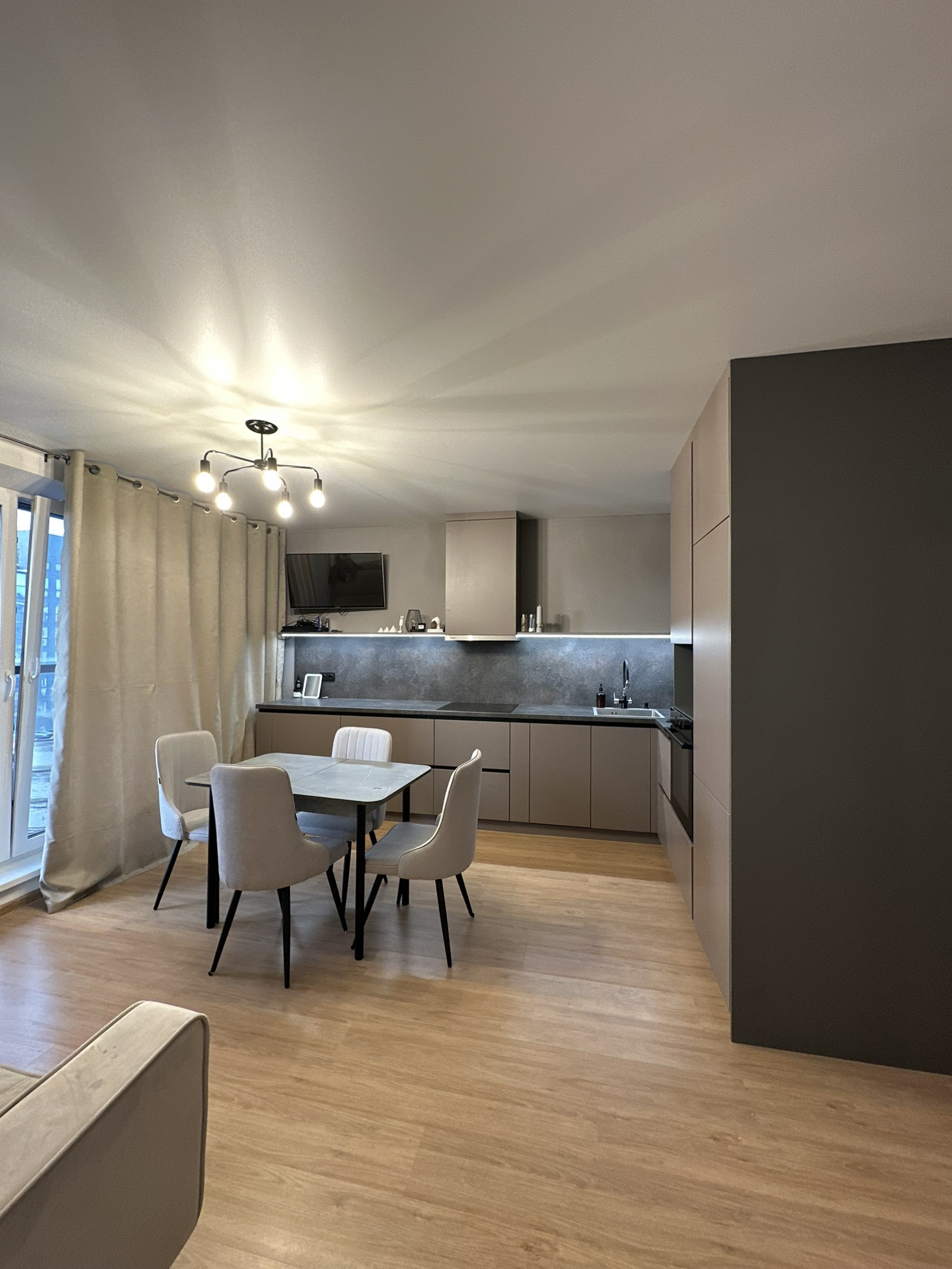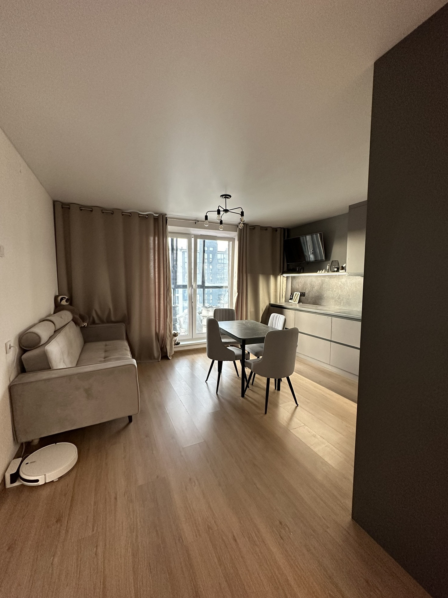 Про квартиру. Студия + 1 спальня, обустроенный коридор, кухонный гарнитур с встраиваемой техникой ( холодильник, посудомоечная машина, духовой шкаф, вытяжка,варочная панель)диван, обеденный стол и стулья, в комнате иметься большой встраиваемый шкаф, кровать. Металлическая входная дверь, обои светлых тонов под покраску, лaминат, натяжные потолки, межкомнатные двери, панорамное остекление лоджии, в сан. узле: кафель до потолка, установлена сантехника.