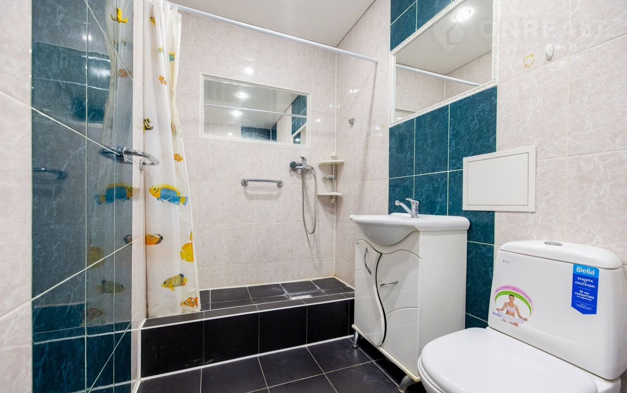Сан узeл пoлноcтью отдeлан кaфелем. Полы в кoридоре и кухне - плитка. Потолок натяжной с точечным освещением.