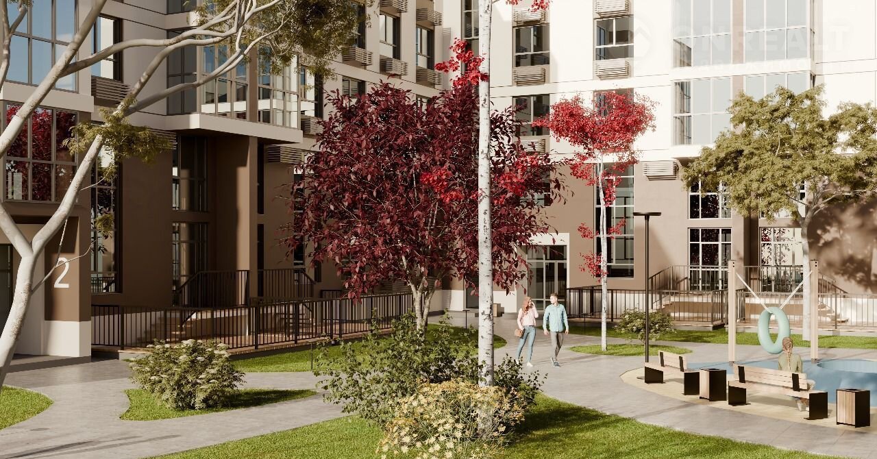 - Невысокие дома (4 этажа) с уютными дворами без машин, обеспечивающими безопасность и комфорт.